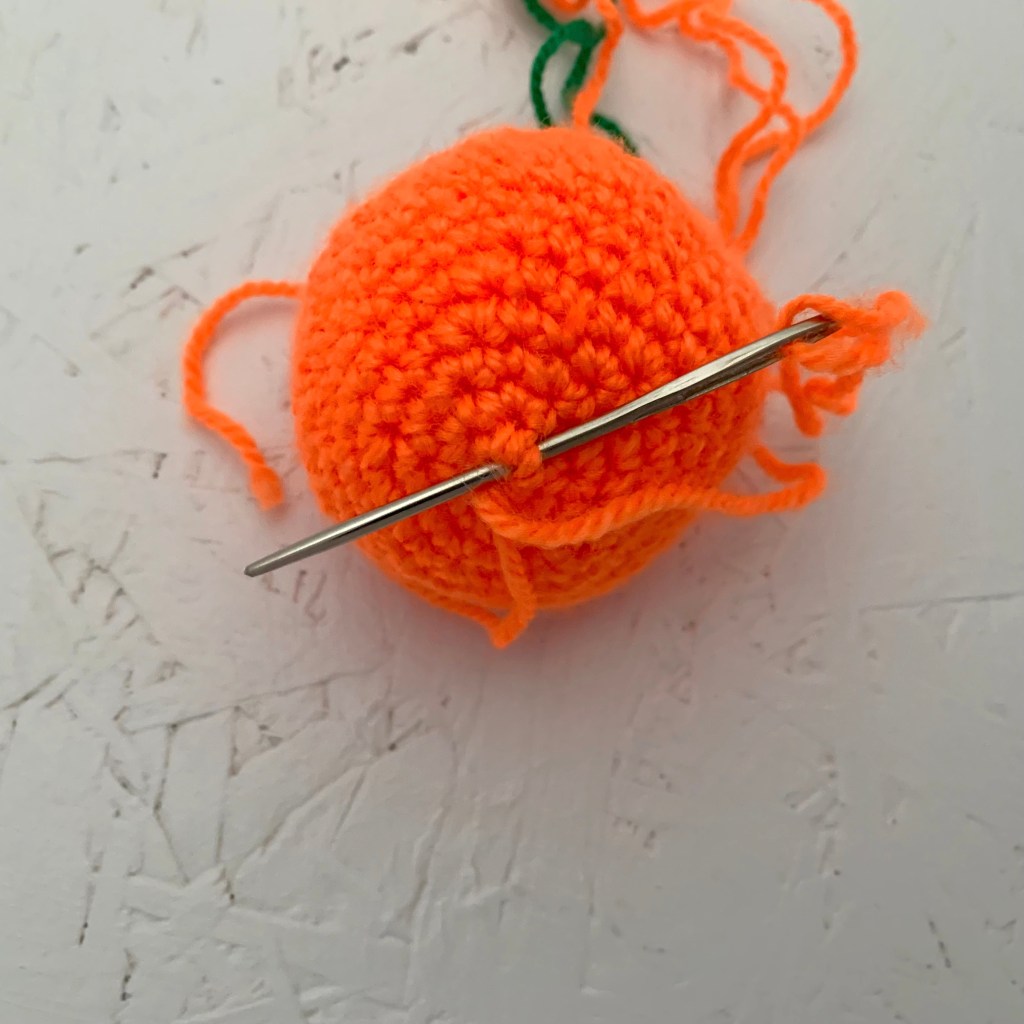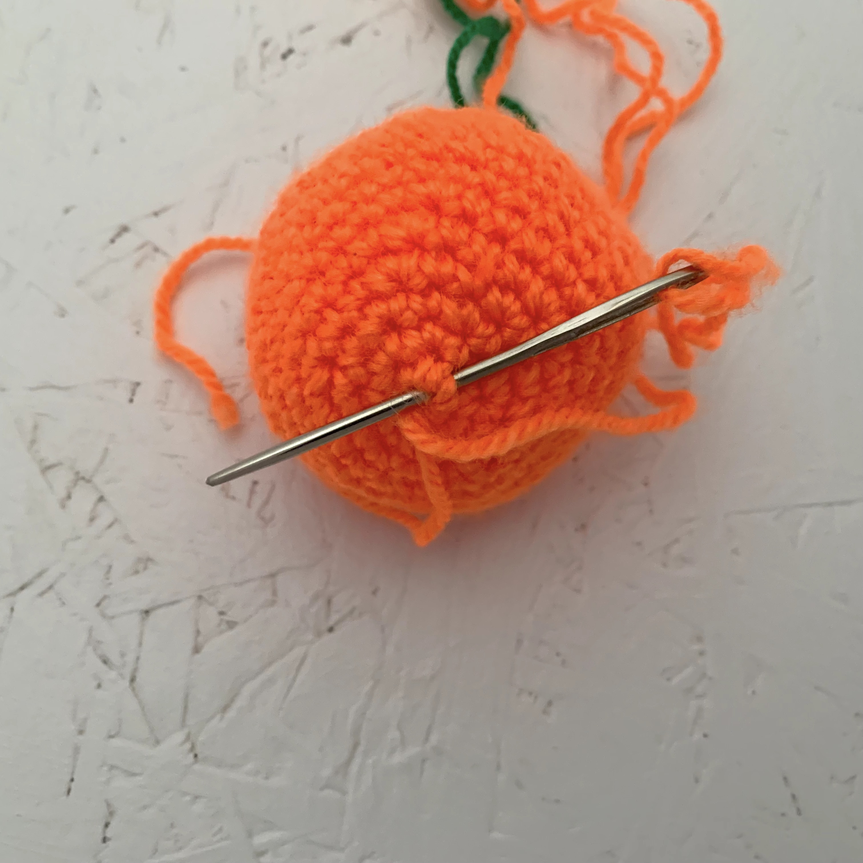 - Cut a long length of orange wool and cast on at the base of the pumpkin, then put the needle up through the middle of the pumpkin so it appears at the top.
