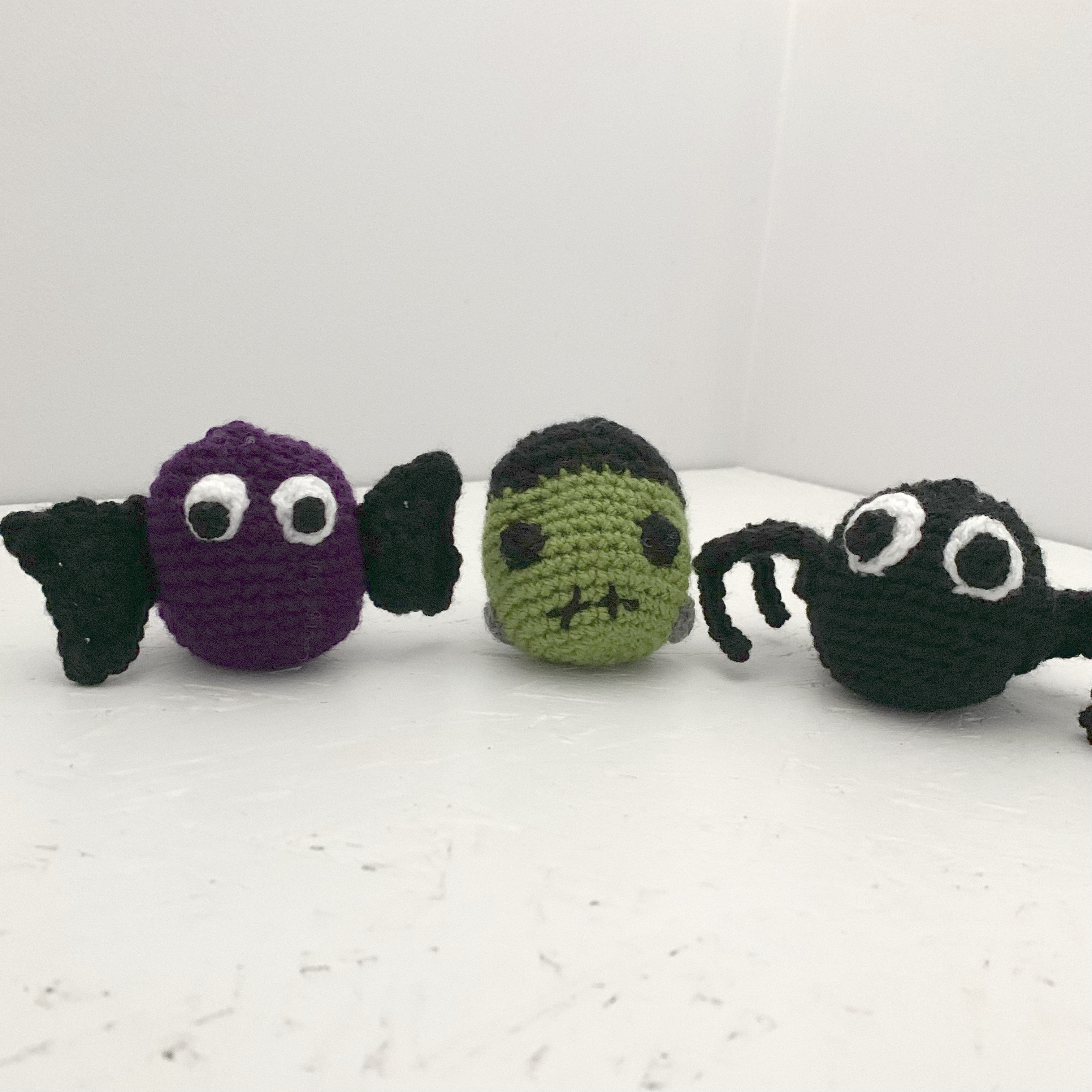 It started with my previous mini Halloween decorations/stress balls pattern for a pumpkin, eyeball and mummy, and I had so many ideas leftover for more when I finished I decided to make those too! .