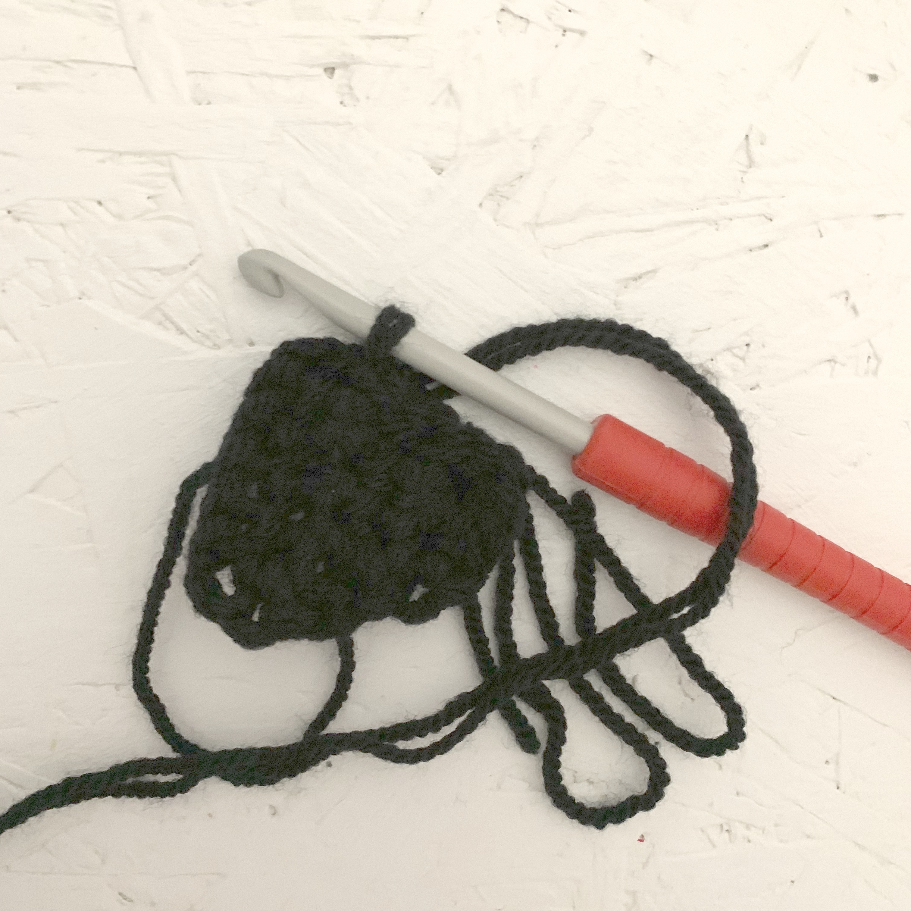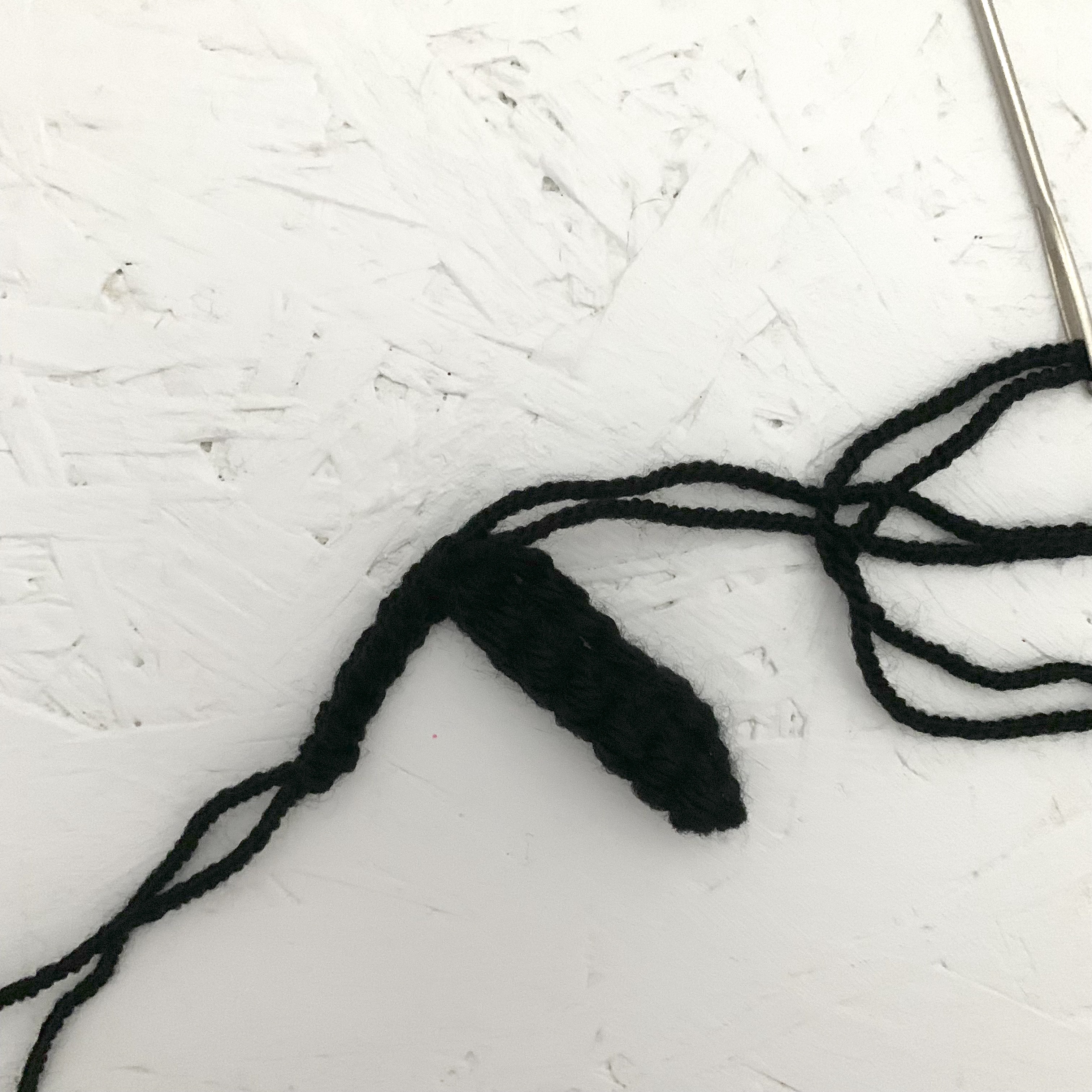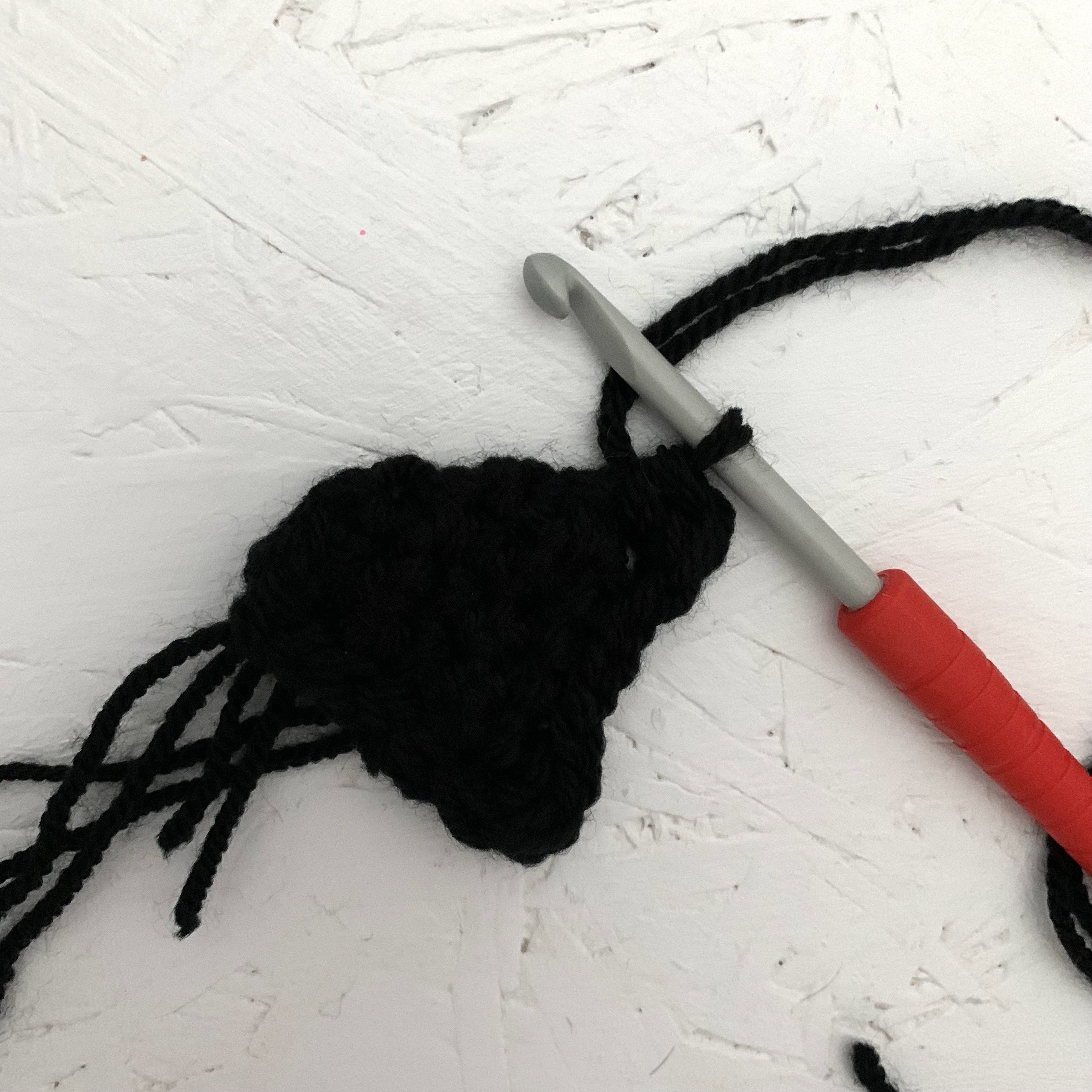 Round 12: *sc2tog, sc into next five stitches. Repeat from * around. Change to black wool and a 5mm hook on the final yo of the last sc (30sc).