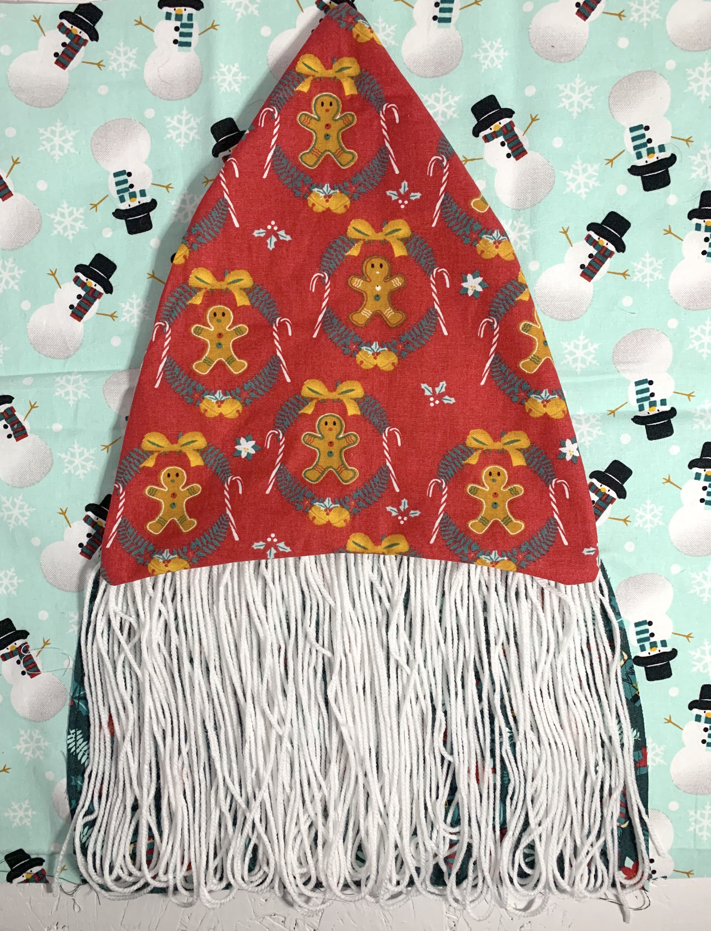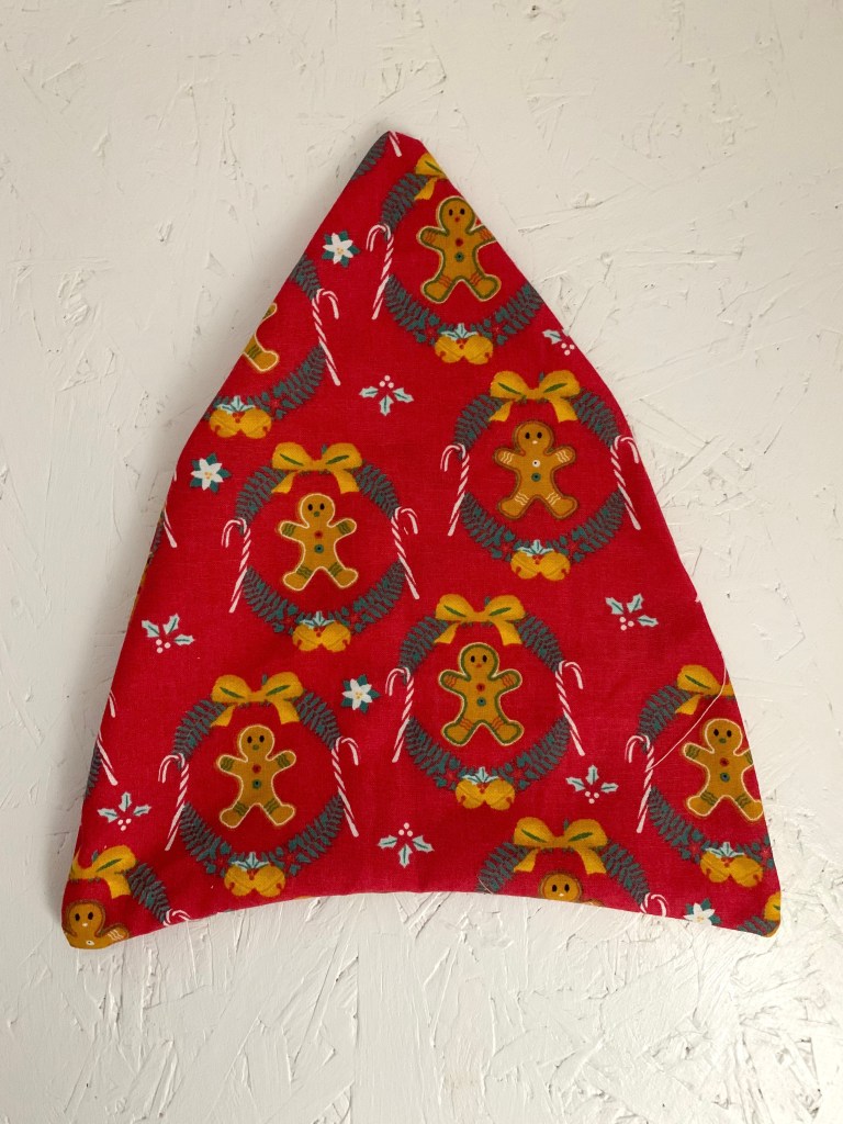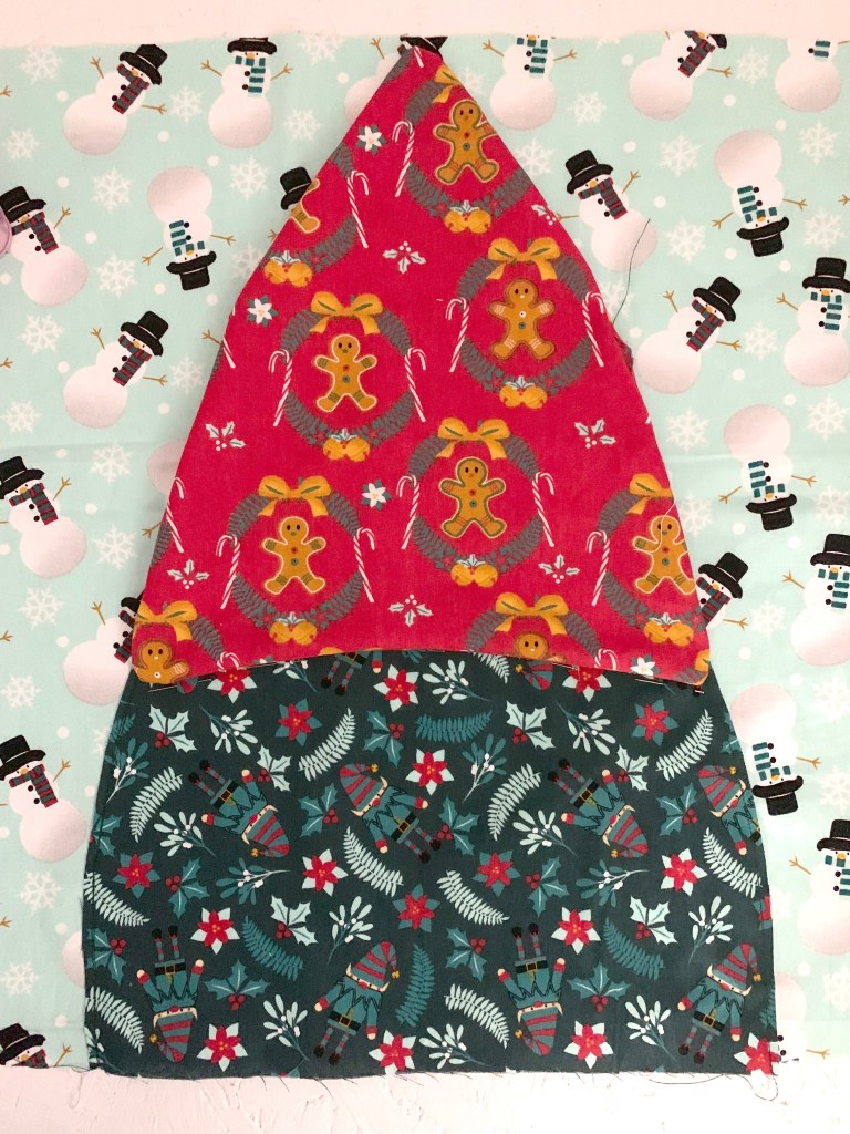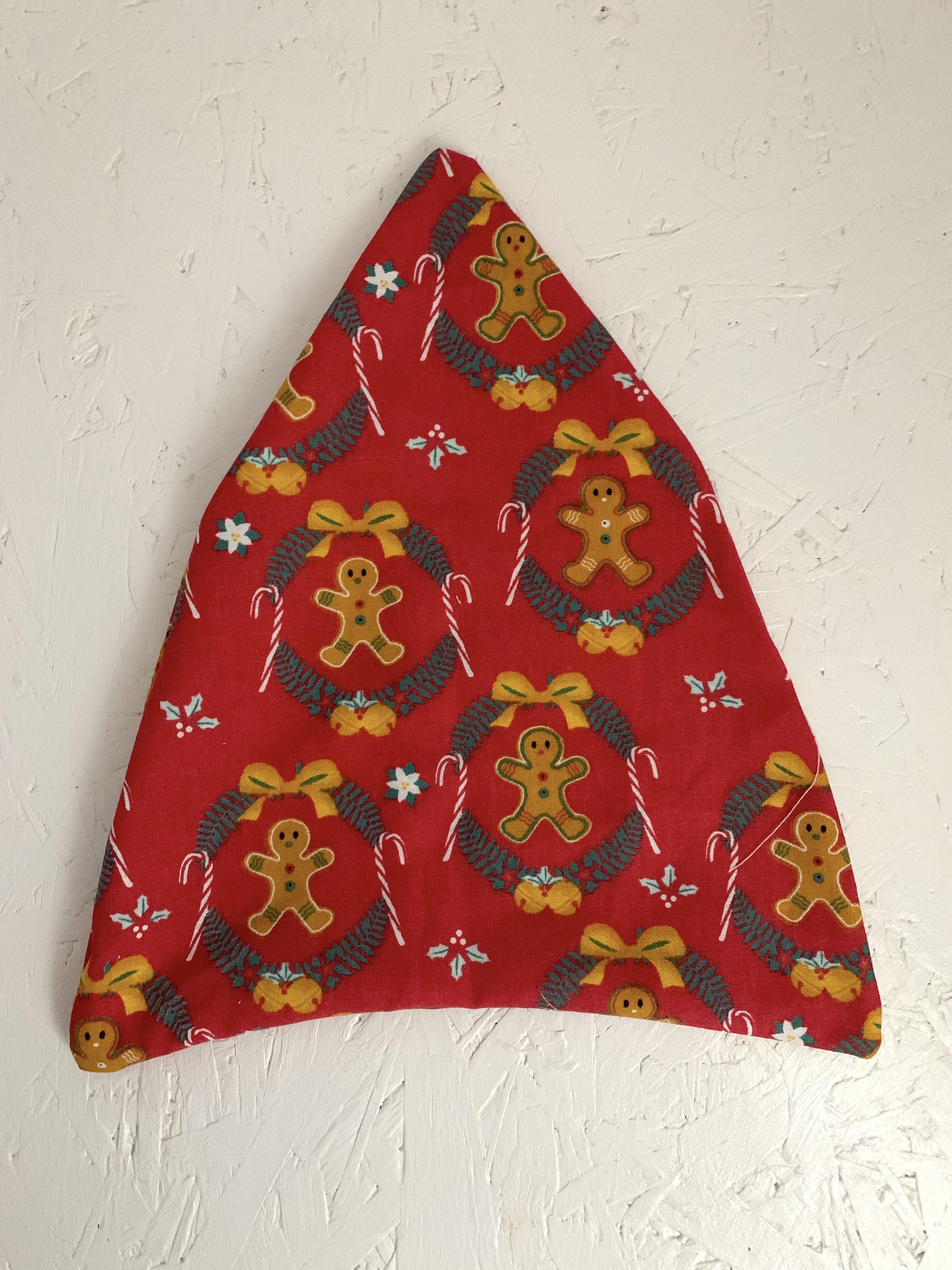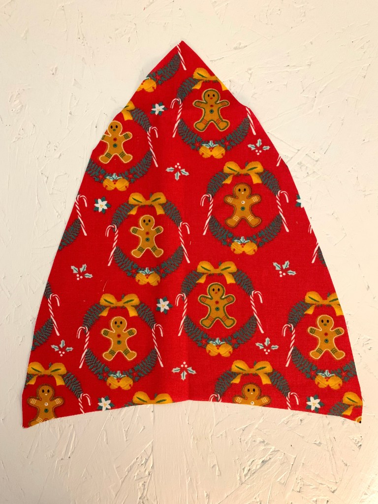 - For the gnome hat: Take one the Gingerbread wreaths 28x30cm pieces of fabric and fold in half so it is 15x20cm. Starting from the base cut the fabric to form the hat. Next making sure to have the fabric with its raw edges to the left, cut a curved line starting from the bottom left hand corner to 1cm up from the bottom at the folded edge on the right hand side. Repeat with the other fabric piece.