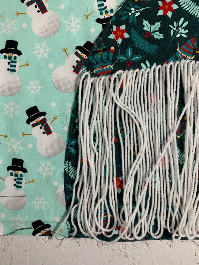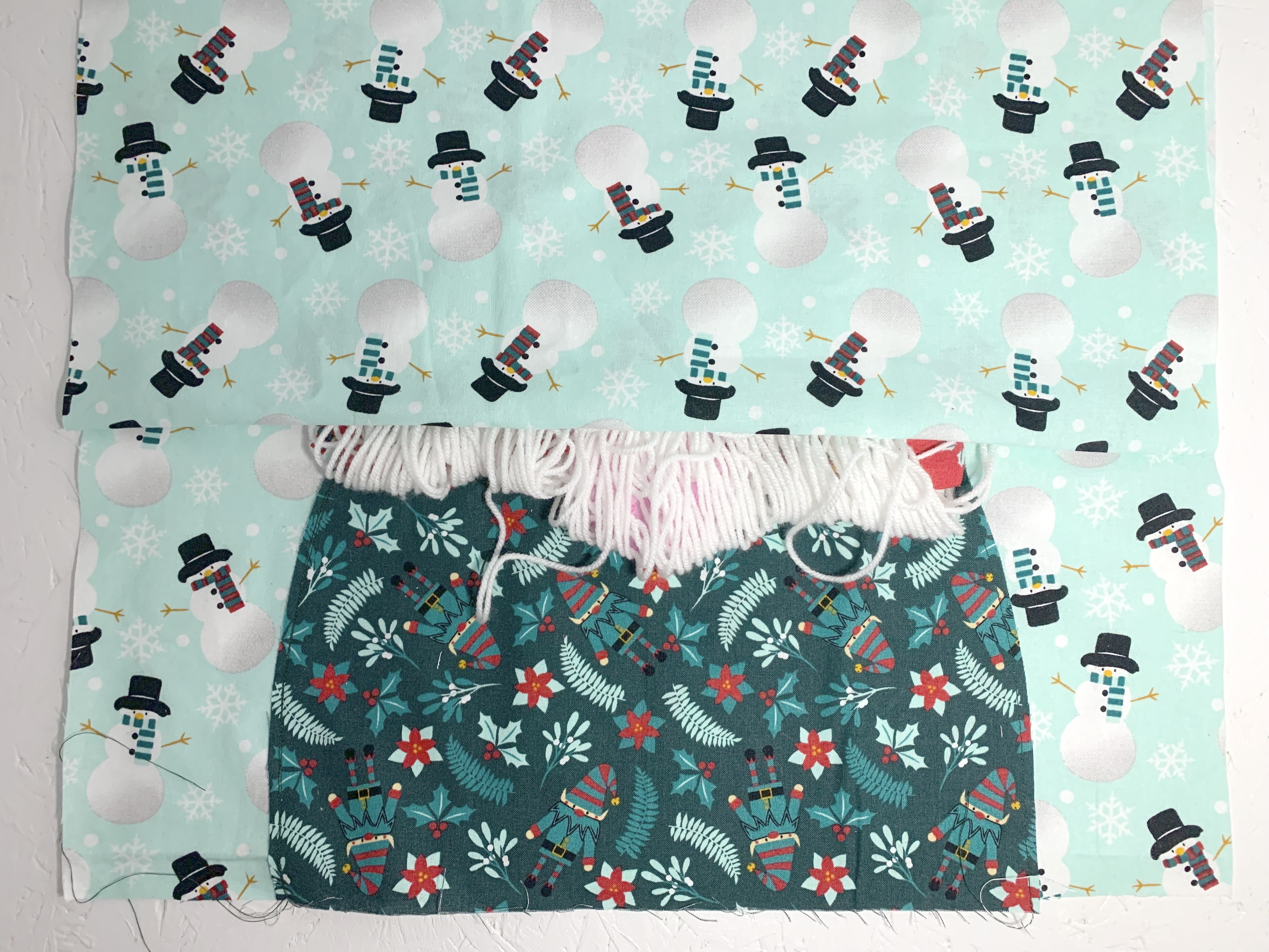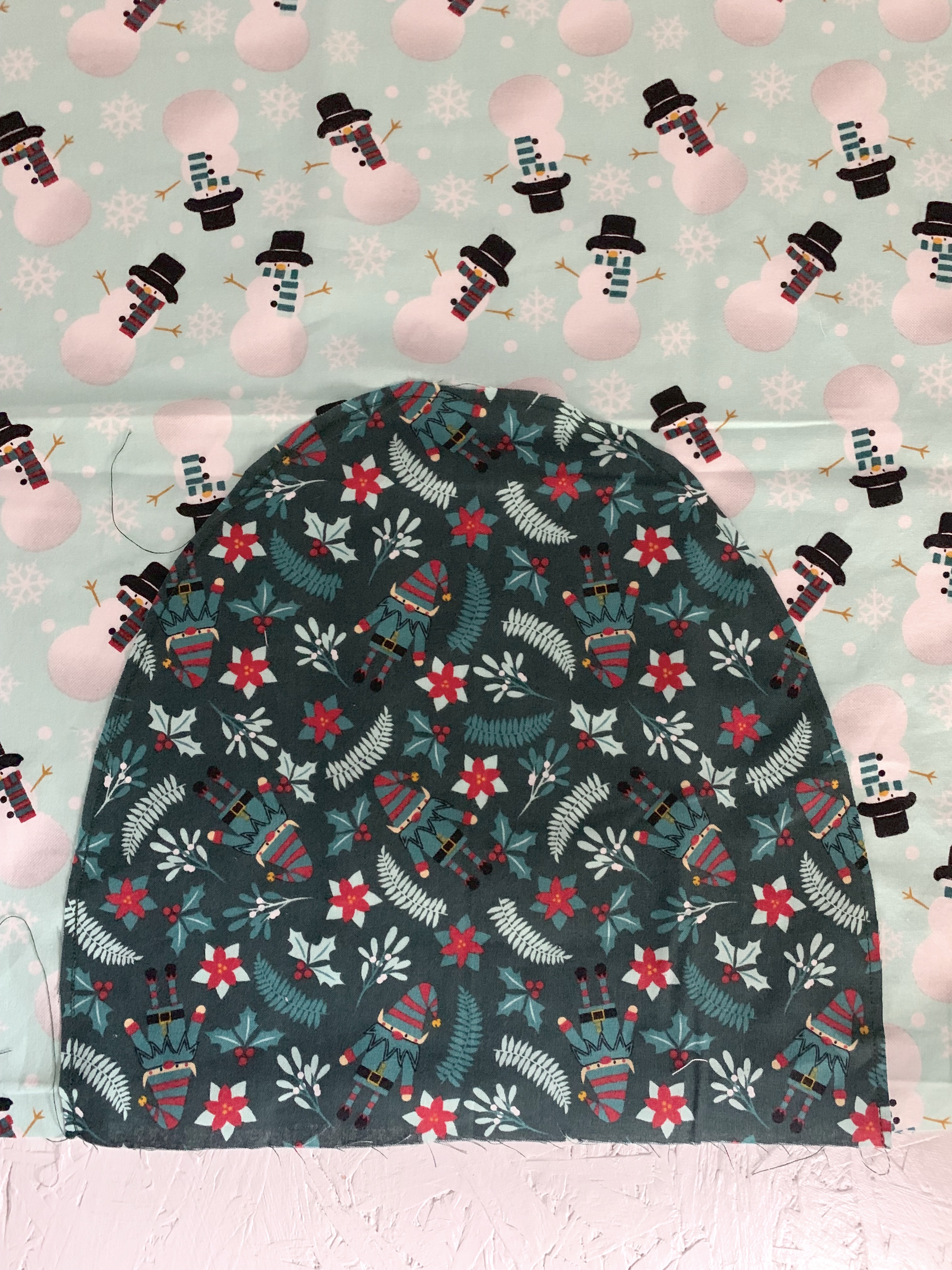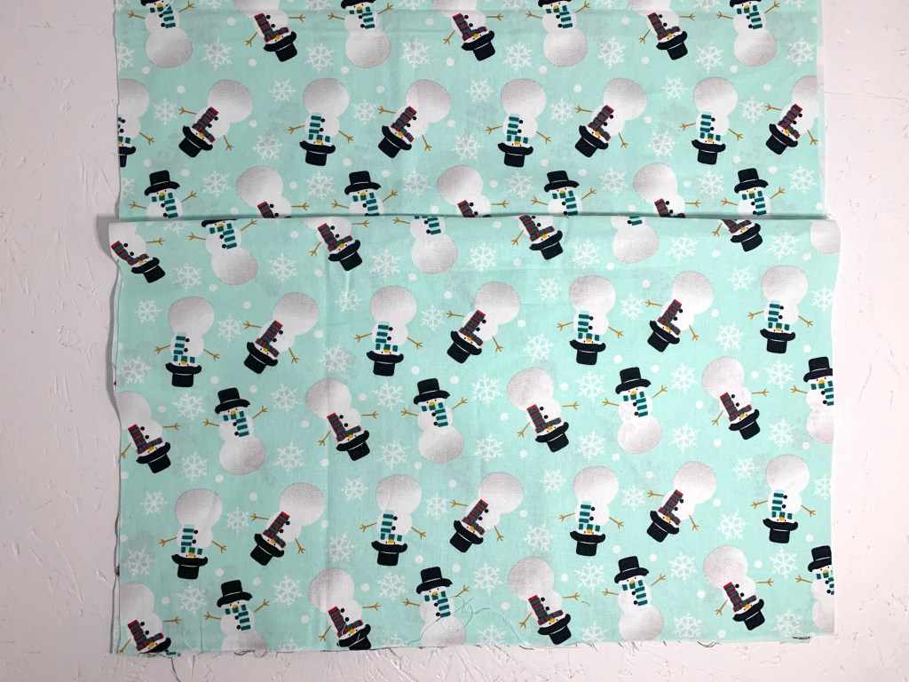 - Place the front cushion piece right side up then take the 2 the Icy snowman 46x50cm pieces of fabric, fold in half so they are 26x25cm then place one top of the front piece with the raw edge along the top raw edge of the front cushion piece, then place the second piece with its raw edges along the bottom edge of the front cushion piece with the folded top edges overlapping in the middle of the cushion to create the back. Make sure the beard and hat top point is not caught up in the seam before sewing.
