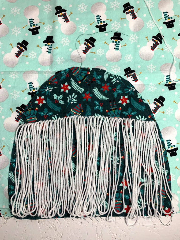- Take the white wool and create large loops to form the beard sew the loops to secure at the top of the beard just above the pinned hat line. Complete another row above the first.