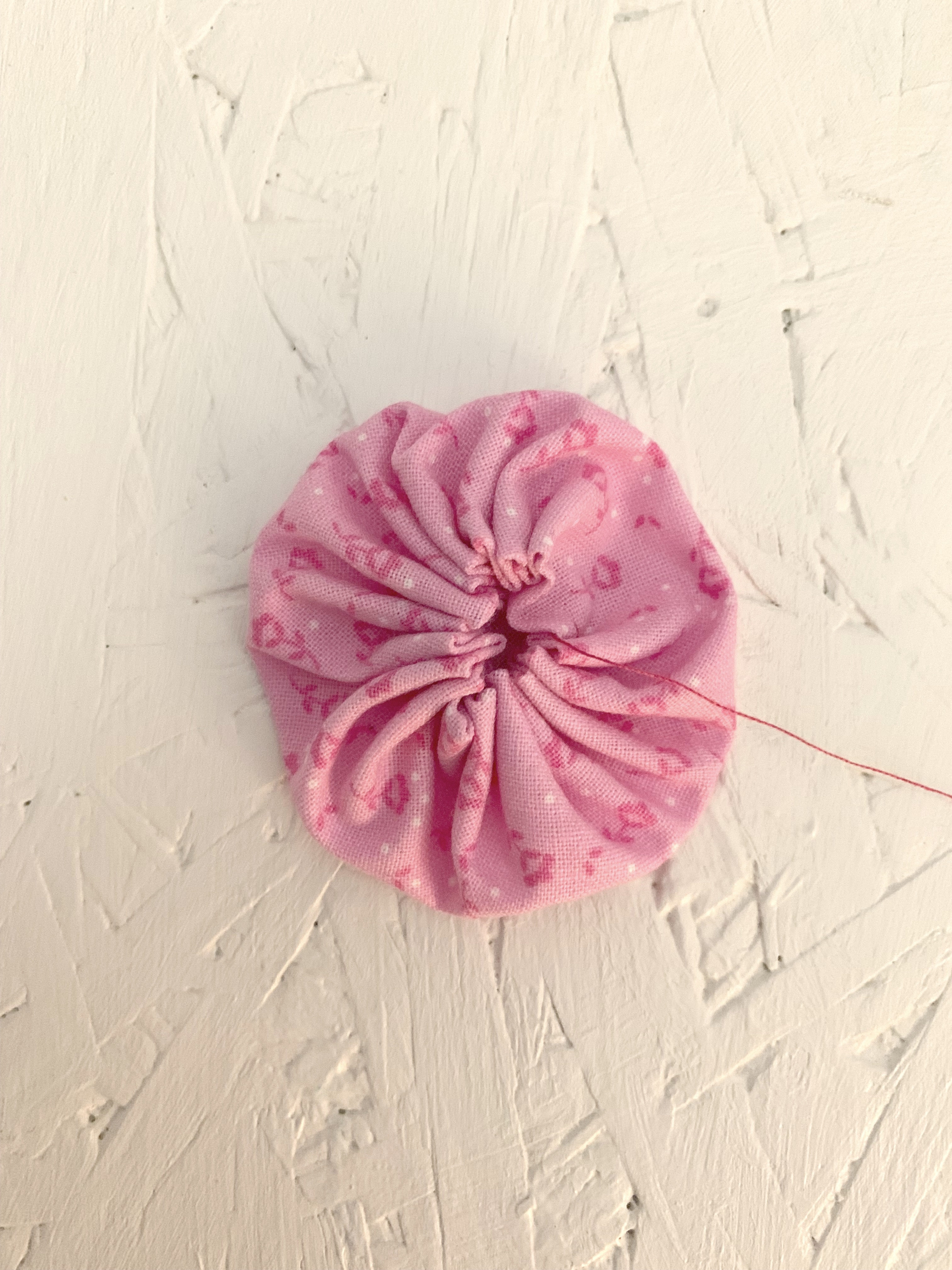 - For the nose: Take the circular pink fabric piece and place right side down, fold in the edge by 0.5cm and sew around, pull the thread to form a fabric yo yo. Sew a couple of stitches to secure.