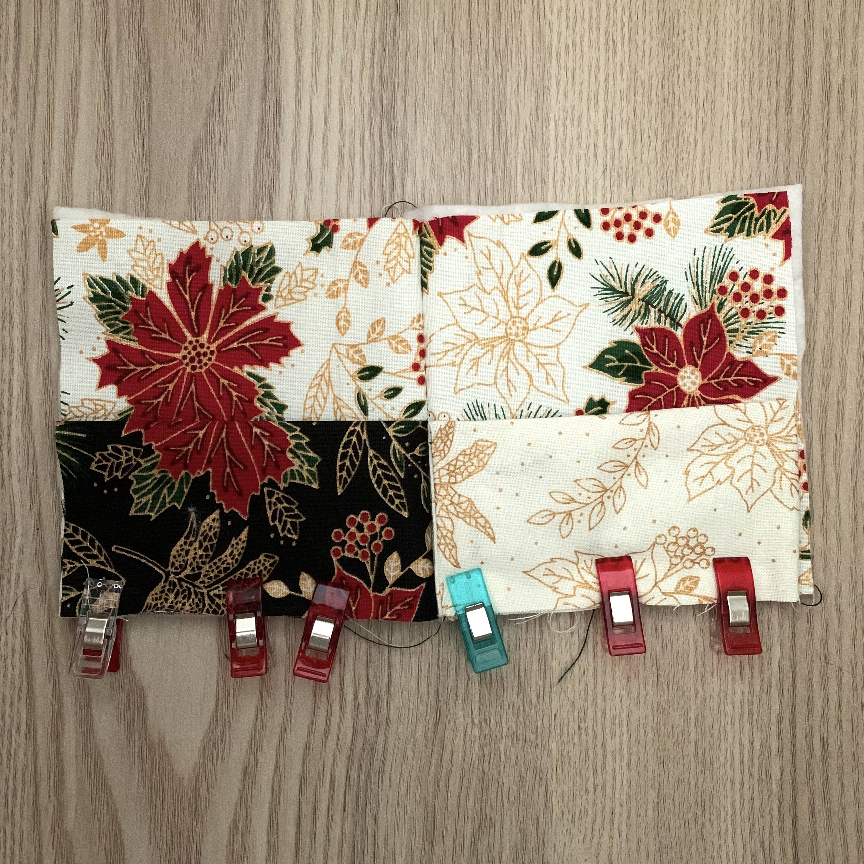 - Place a piece of batting and put a main cube piece on top to form the base, take one of the bow strips and place the bow strip in the middle of one of the side edges of the base with the raw edge of the bow strip against the side raw edge of the base. Pin to secure and repeat with the other bow strip on the opposite side. Place the base into the joined sides (right sides together) and sew to secure.
