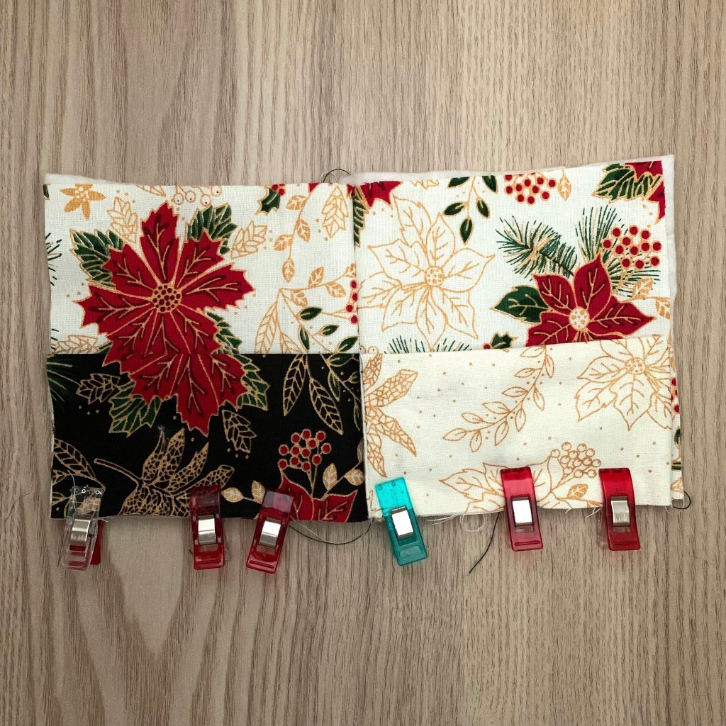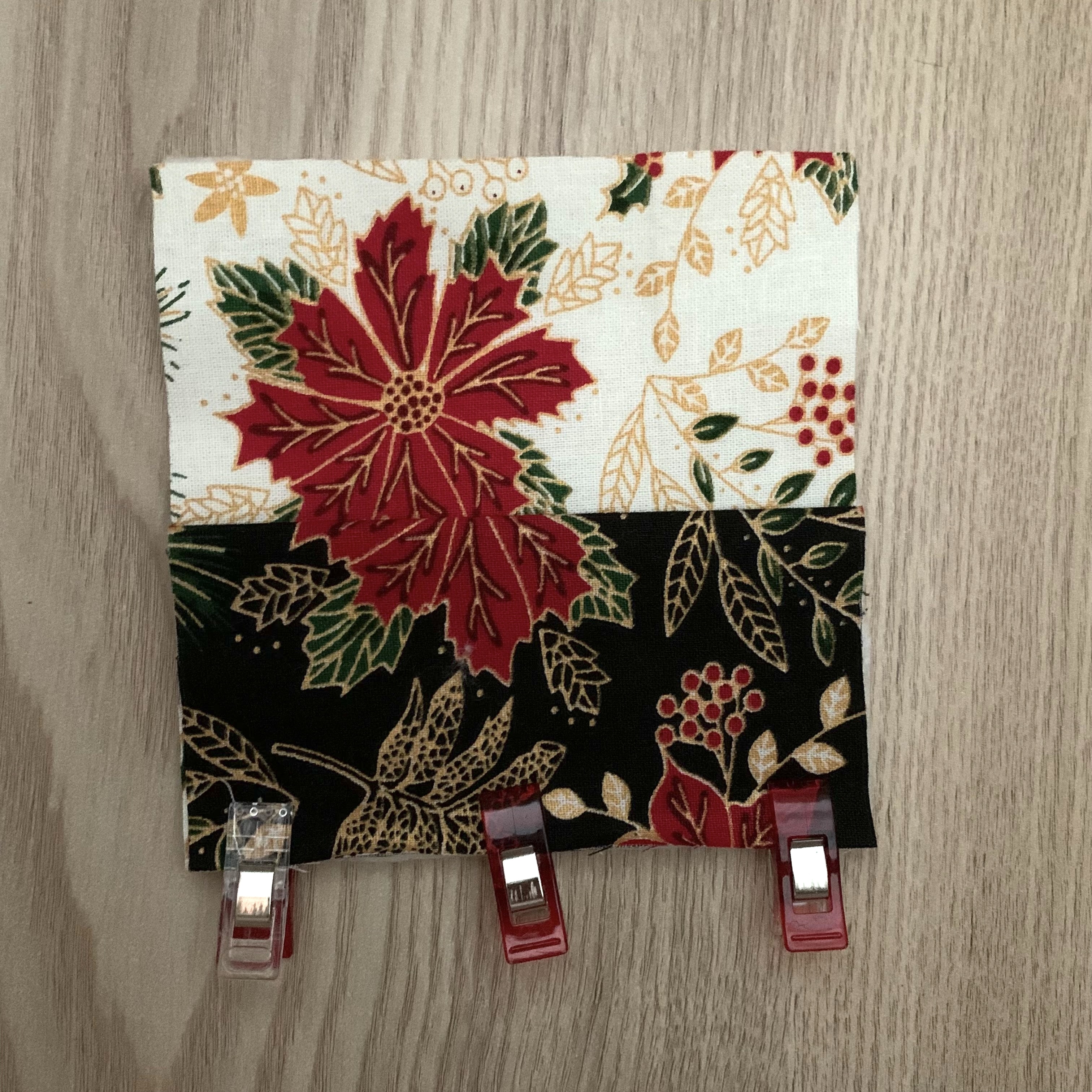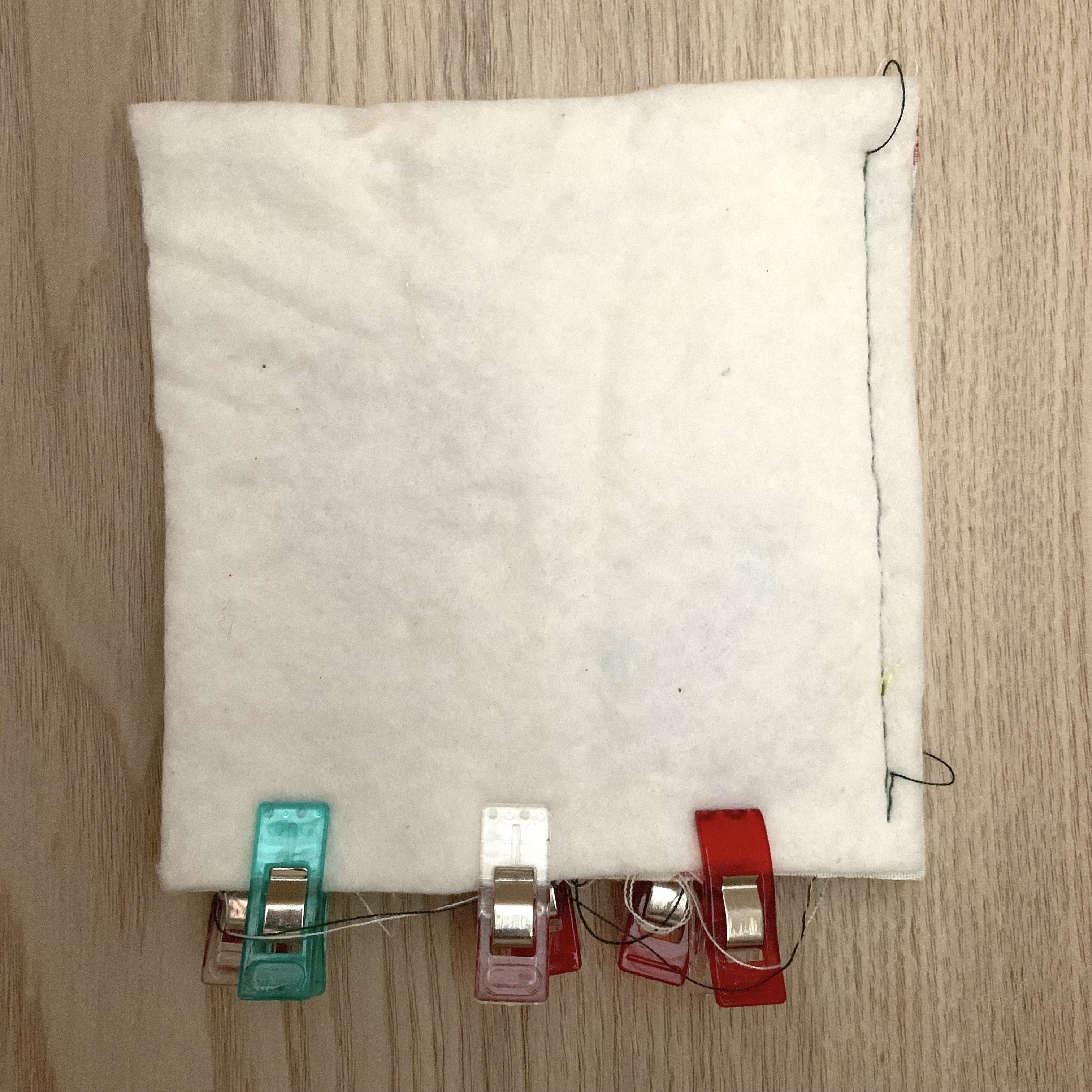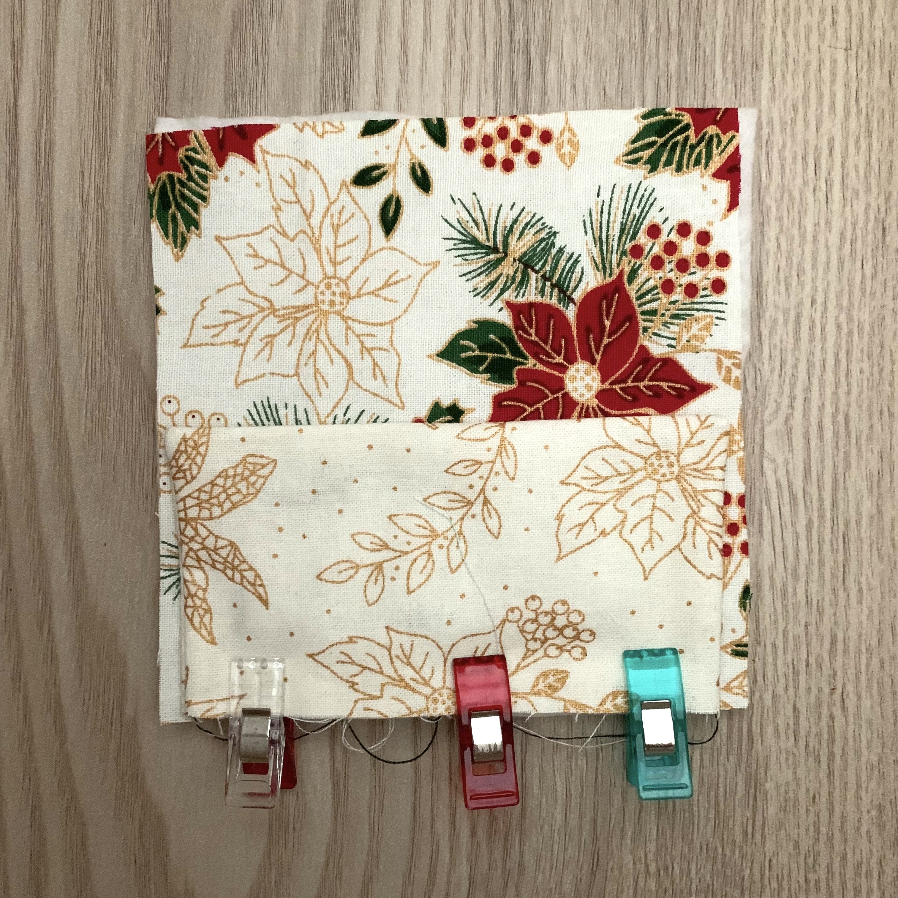 - Take a piece of batting and put a main cube square on top, fold the pocket square in half (placing wrong sides together), place on top with the raw edges of the pocket piece against the raw edge of the bottom of the square and pin to secure.