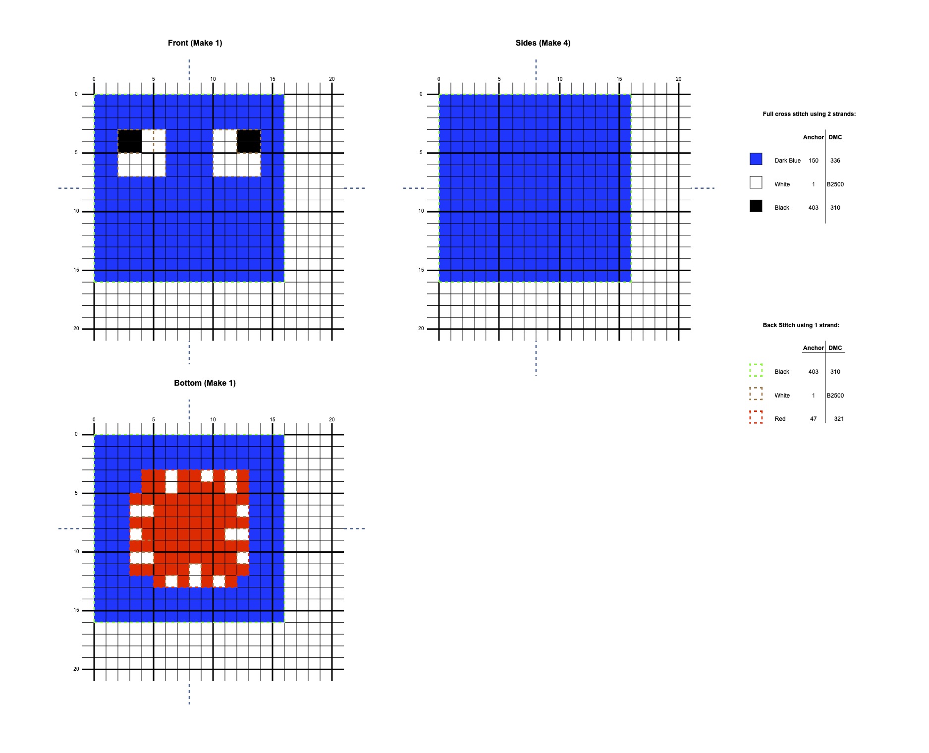- When cross stitching the cube sides, make sure to leave at least a 4cm gap between each of the sides for cutting out later on.
