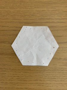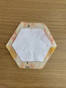 Take one of the paper templates and one of the pieces of cut fabric and place your paper template in the middle, starting on one side fold over the edge of the fabric and sew using a tacking stitch to secure. Repeat with the remaining sides. Repeat with all templates and fabric.