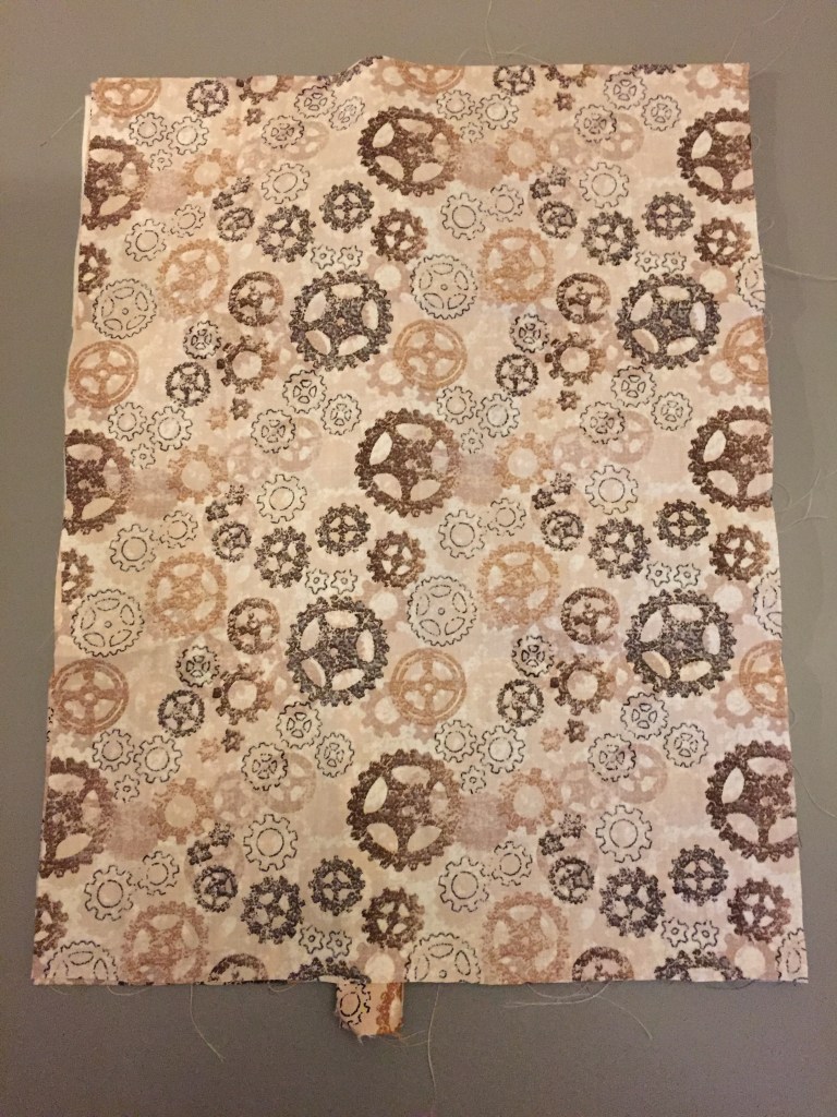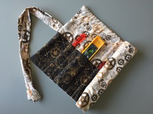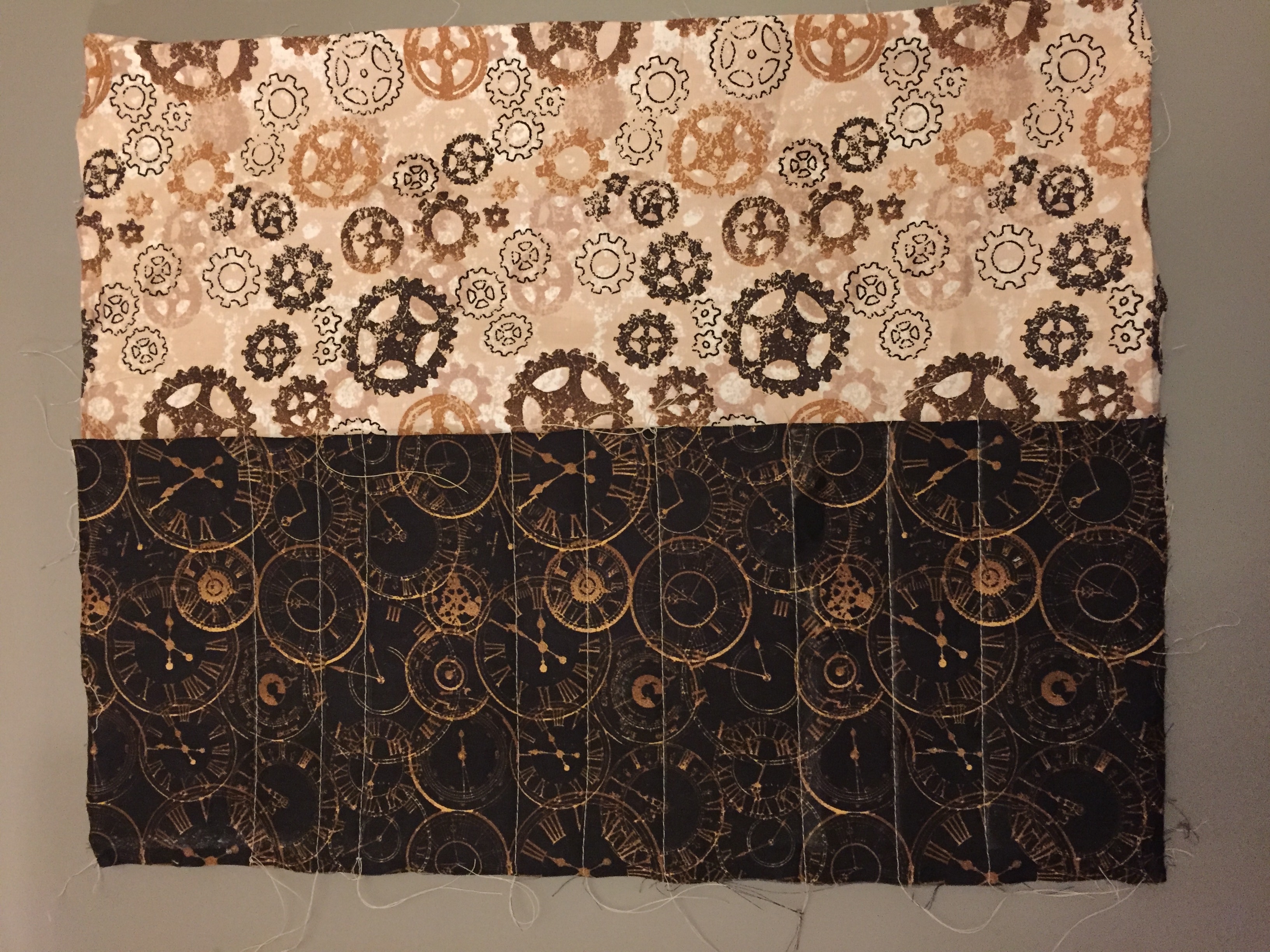 - Place the 44x35cm cogs fabric piece (without the quilted detail) right side up and place the pocket along the bottom edge. Sew lines down the black clock fabric at varying distances apart to create sections for the tools.