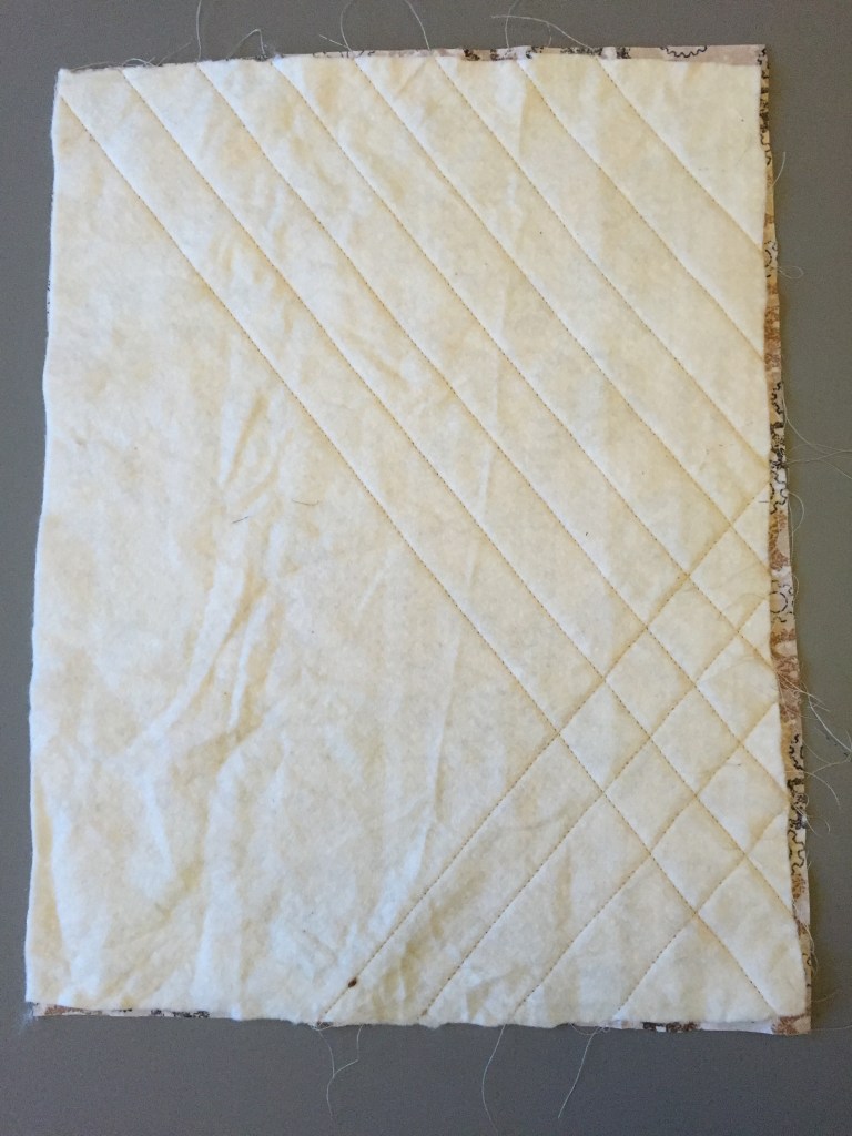 - Take the piece of 43x33cm wadding and place onto the wrong side of one of the 44x34cm cog fabric pieces. Add quilted detail – I used a ruler to mark out diagonal lines from the two bottom corners, but you can add any detail you like.