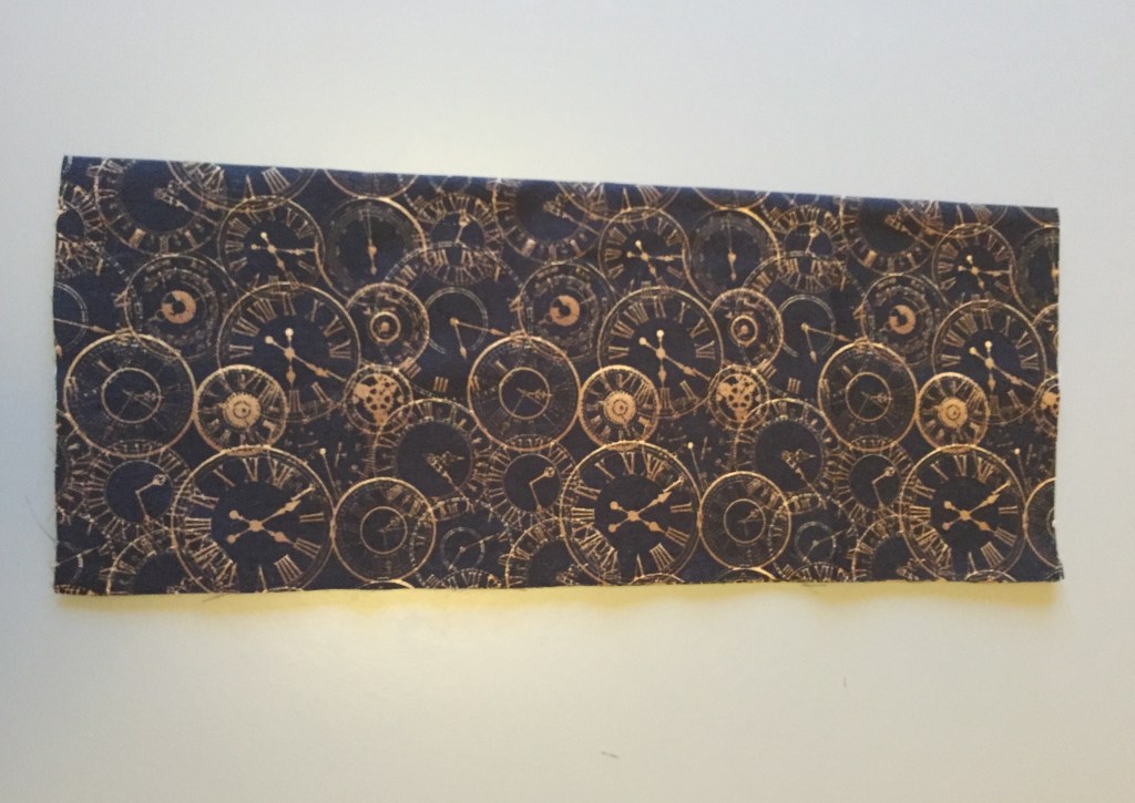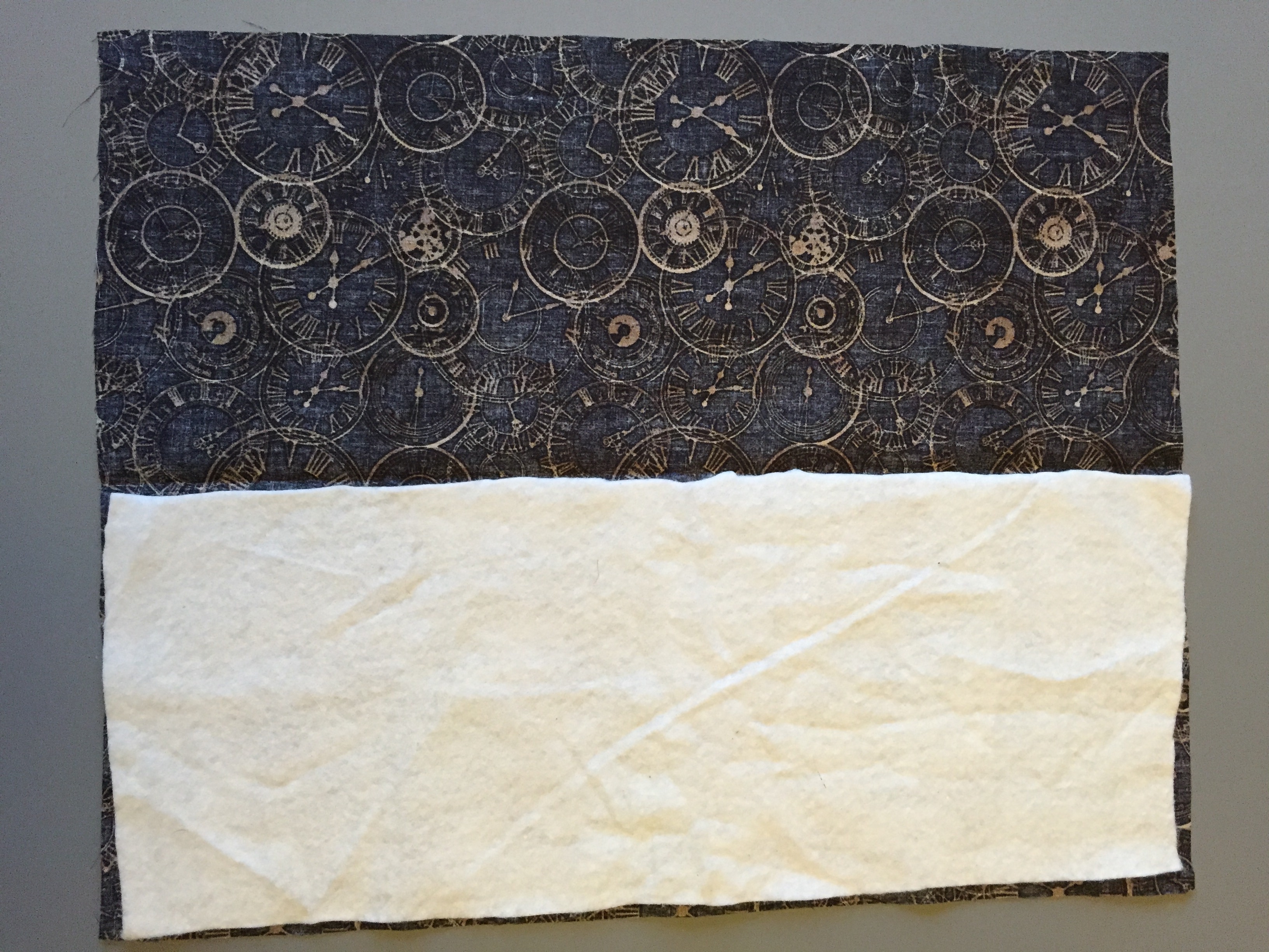 - Take the clocks fabric piece and lay the 17x43cm wadding piece along the bottom of the fabric then fold the top over.