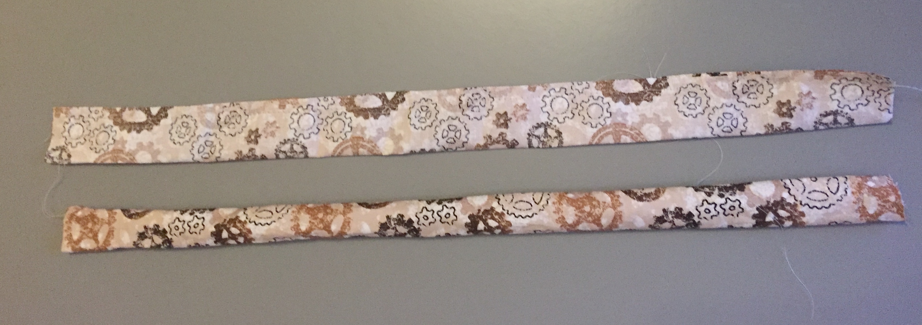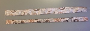 - Fold the 50x7cm fabric strips in half sideways with right sides together. Sew along the bottom and down the side leaving the top edge unsewn. Turn the right way around. Repeat to make the second one.