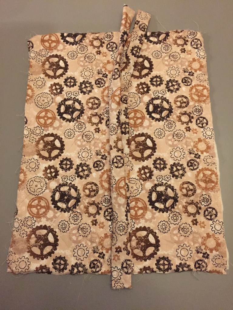 - Take the quilted fabric piece and place right side facing up. Place the two fabric ties on the left hand side half way down with their raw edge 1cm hanging over the edge of the quilted fabric piece. Next place the cog fabric with pocket attached right side facing down and pin to secure all components, make sure the loose ends of the ties are tucked in at this point or you will end up sewing them into the seam. Sew around all the edges leaving a gap of 10cm for turning. Turn the right way and slip stitch close the seam.
