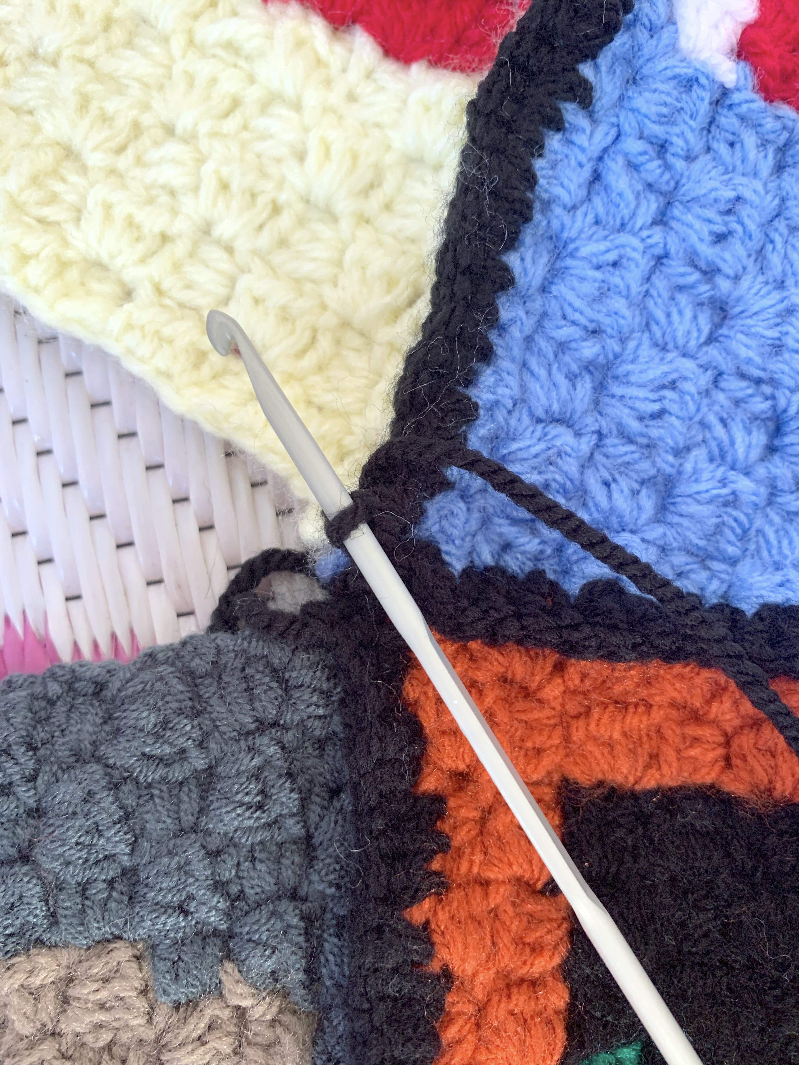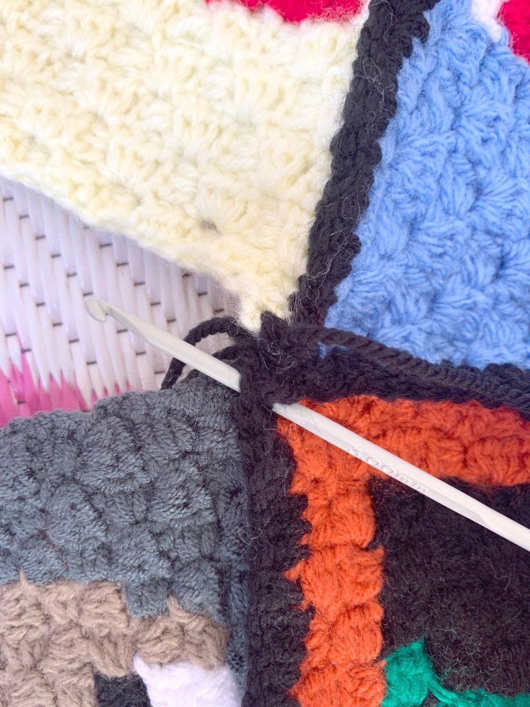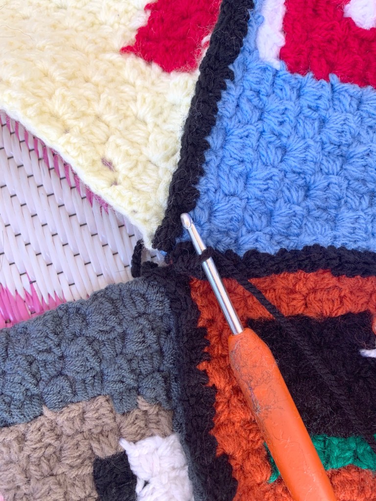 - Take two of the blocks, place wrong sides together and complete sc stitches down the right hand side through both of the pieces side to join: