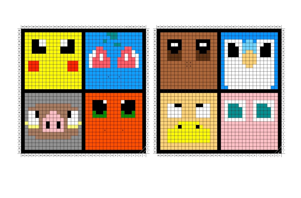 If you would rather not join these blocks afterwards you can make up the cushion as a front and a back piece and then just join the front and back pieces together. I will add a chart for this as well – this will have a black border around each block to make each block stand since it wont have the join line you will have from joining individual pieces, I will also include the links to the individual charts. You could also have the same four Pokemon on the front and back rather than having 8 different Pokemon.