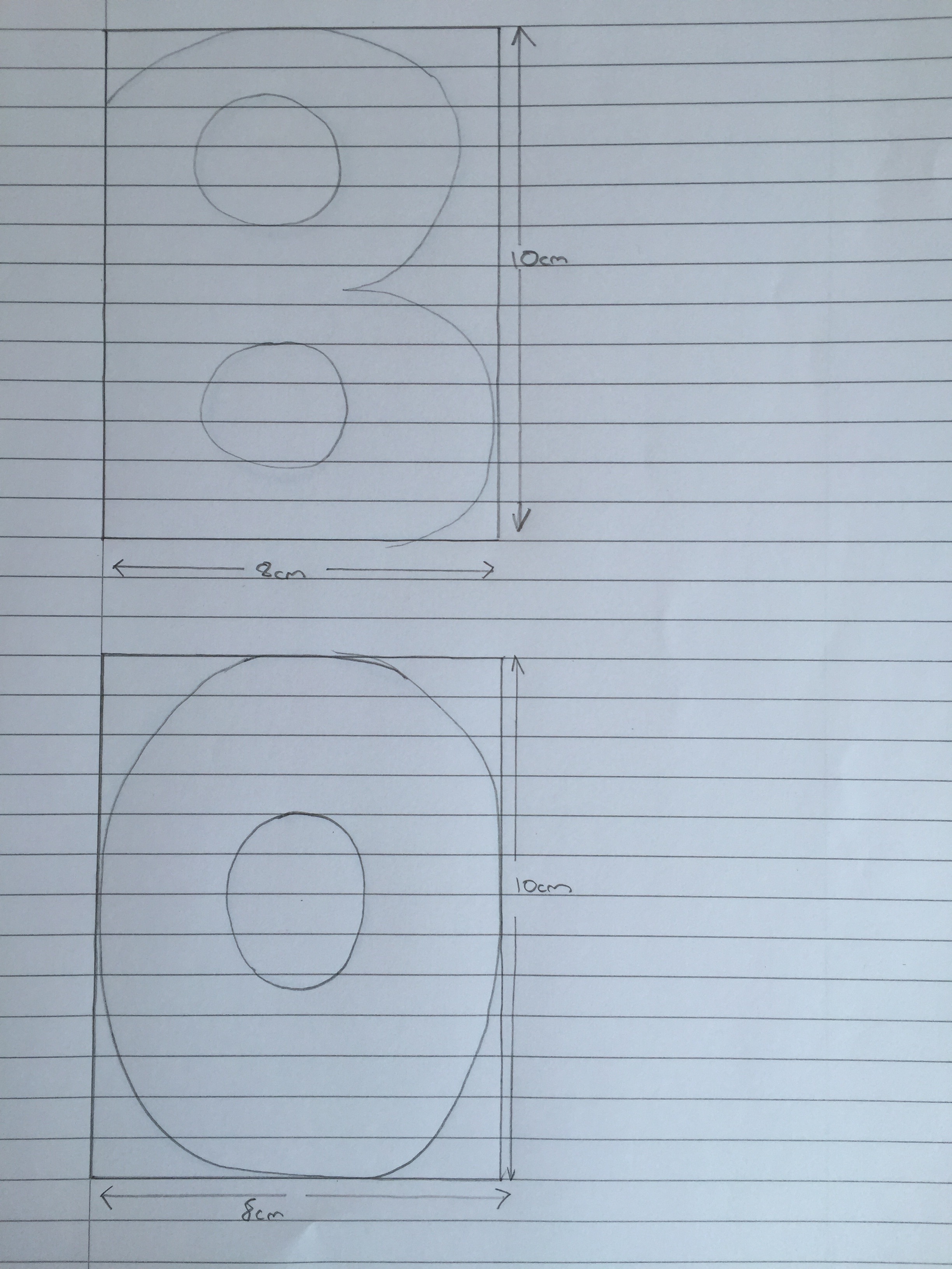 Draw letters 10cm high and 8cm wide) on paper, cut out and use them to cut out the fabric.
