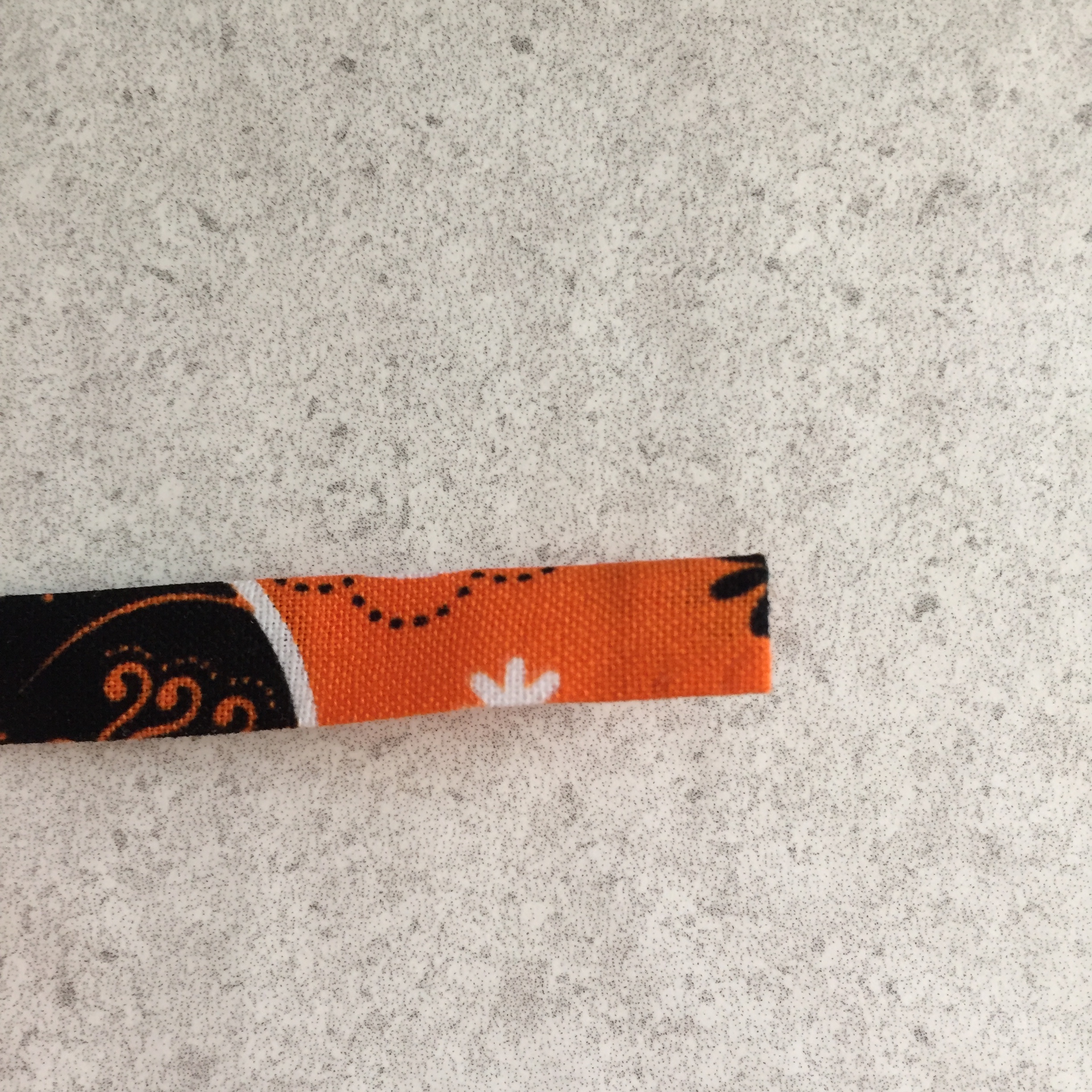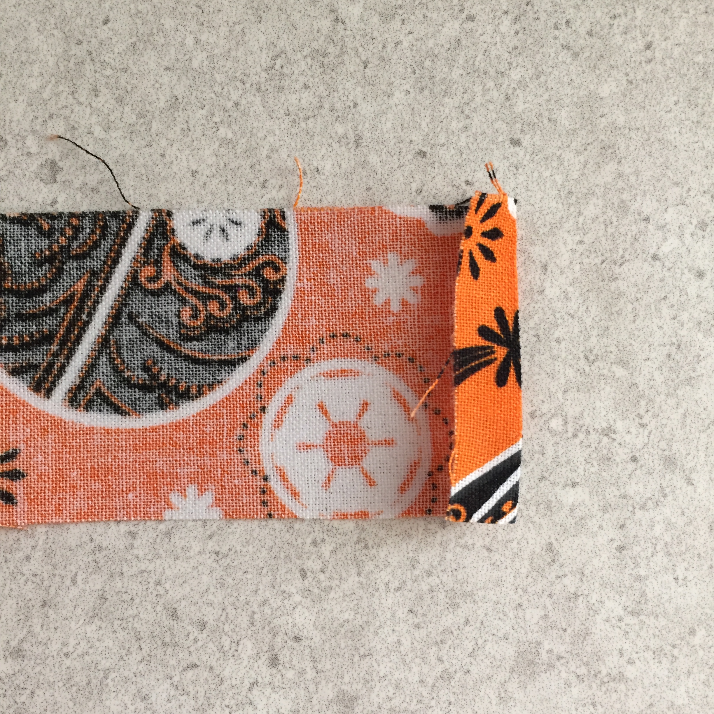 - To make the bias binding for the bunting cut 4cm wide strips of fabric and join together to create a long strip. Then fold in the side edge, press, fold in the top and bottom edge so the meet in the middle and press, then fold the strip in half again and press.