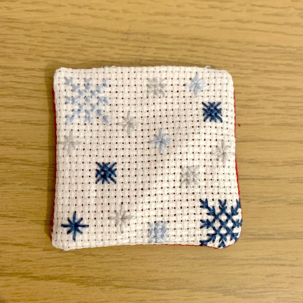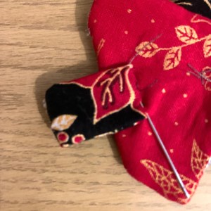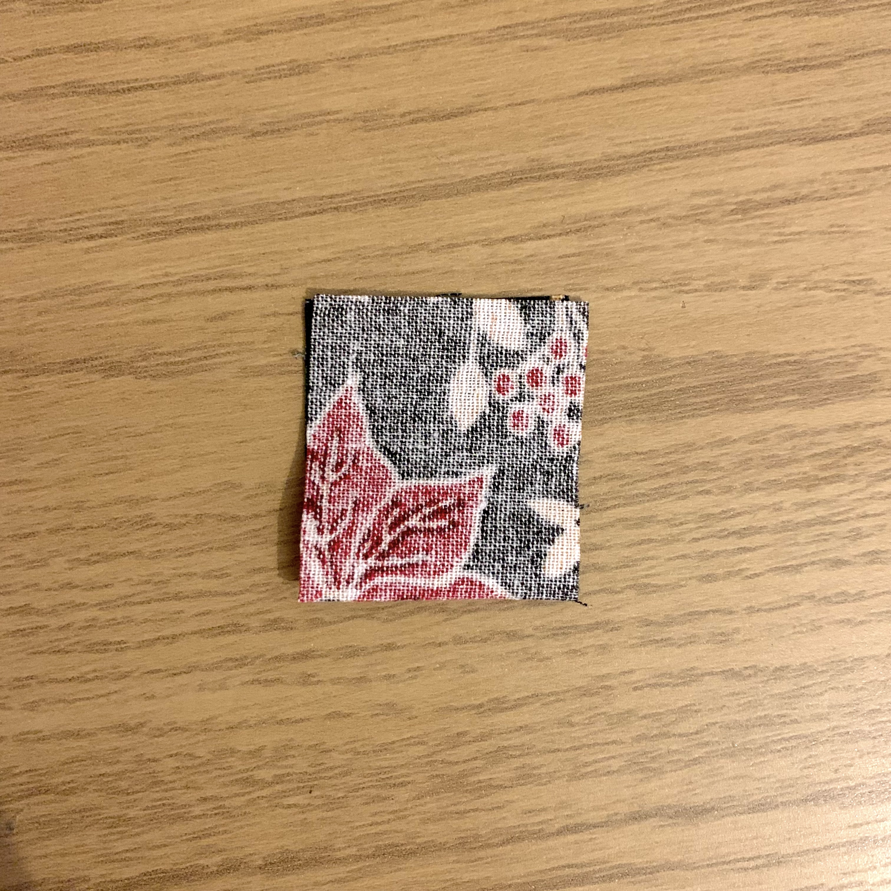 - Take the 10cm of embroidery thread/ribbon and fold in half, place on the back of the smallest square 1cm down from the top of the square and sew to secure.