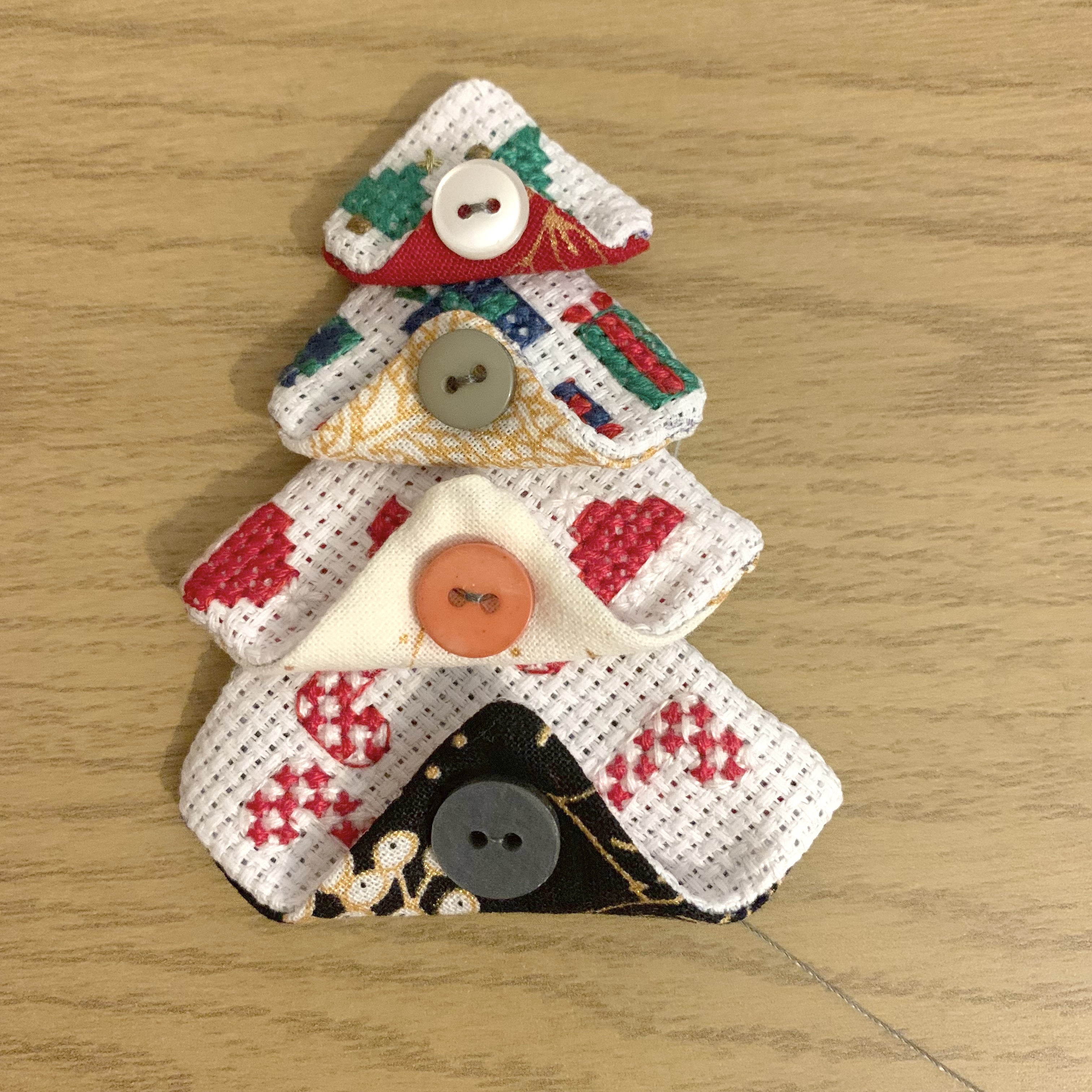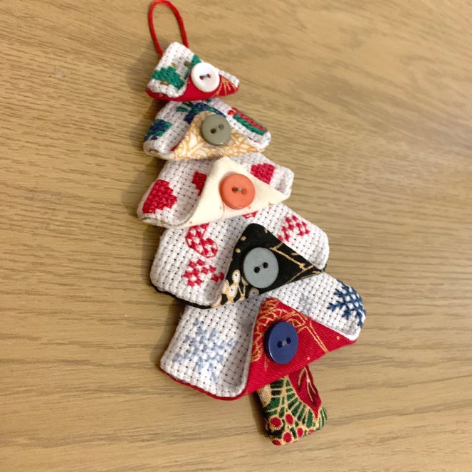 These Folded Fabric With Cross Stitch Design Christmas tree decorations are a perfect quick Christmas sewing make.
