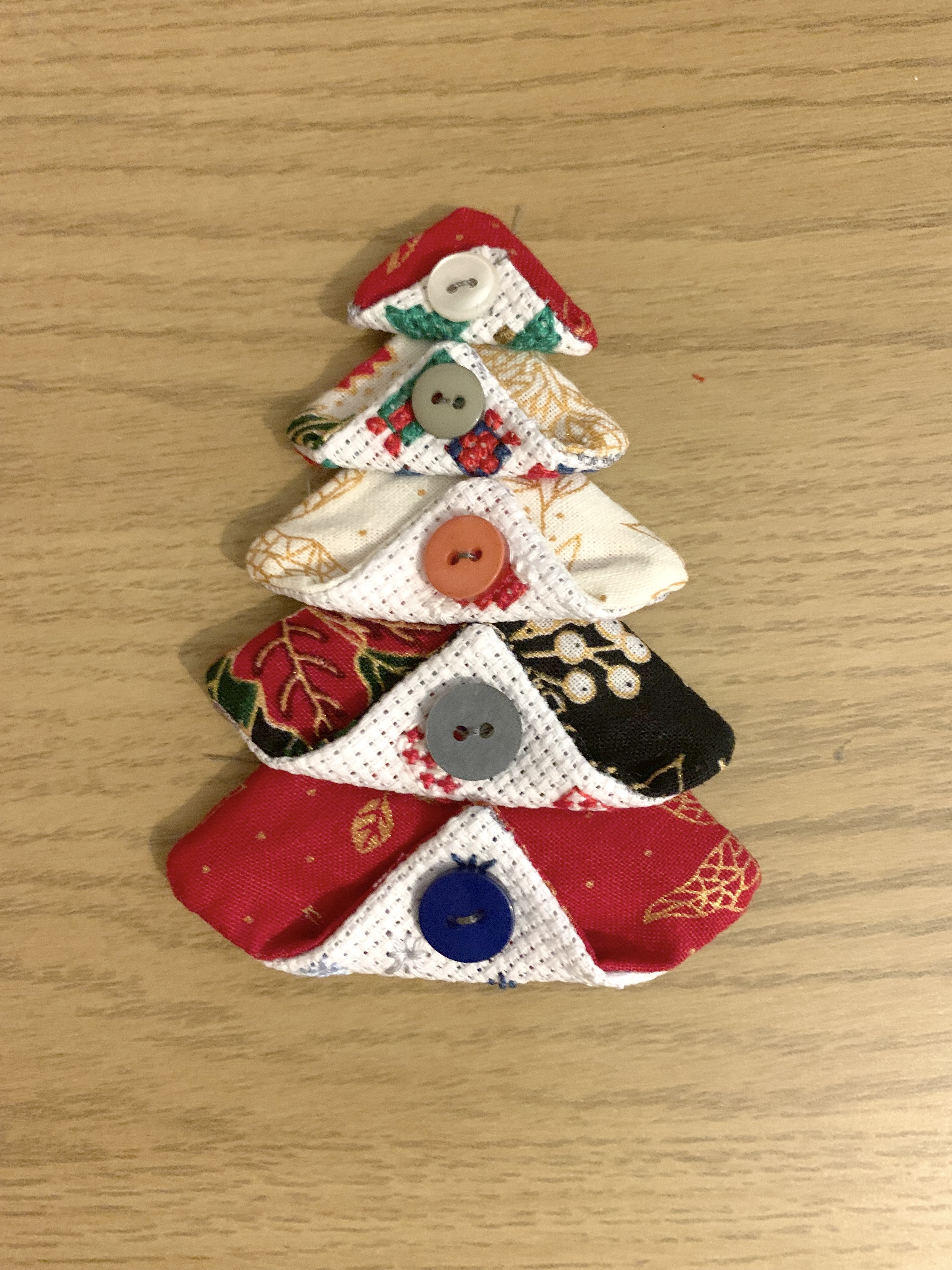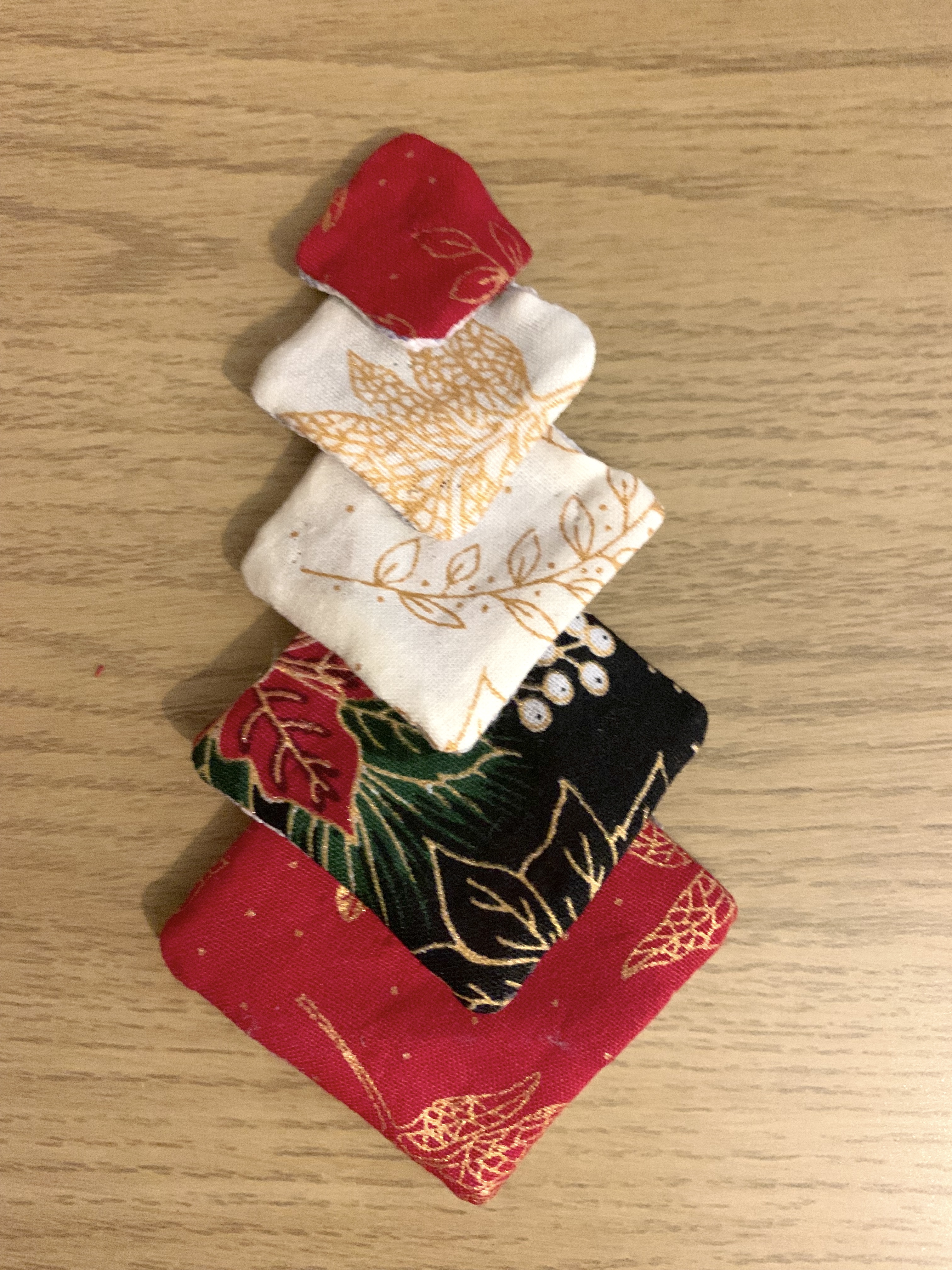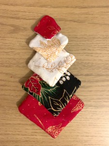 Following on from my previous folded fabric Christmas trees with cross stitch details pattern here is another version agin using fabric and cross stitched designs but folded the other way so the cross stitch design shows on the folded fabric rather than being behind the folded fabric. A sewing tutorial for the original version of this folded fabric Christmas tree I made is also available if you don’t want to add the twist of cross stitch details. I opted to use a different cross stitch design for each of the folded squares but you could choose to use just one of the designs on all of the squares or choose a different colour scheme for the designs if you would like to use different colours to those I have chosen.