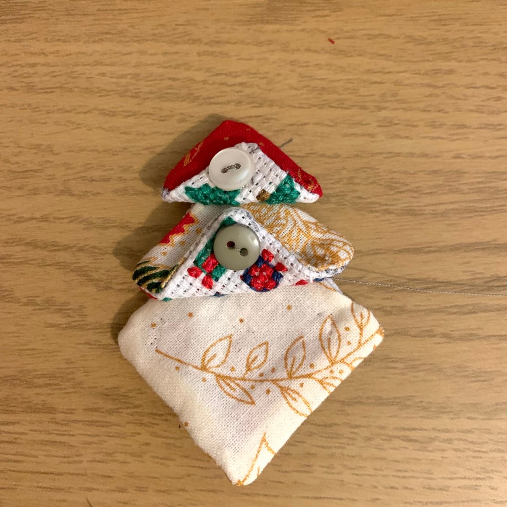 - Starting with the smallest square fold up the bottom point and sew to secure, next sew a button onto the folded part of the square. Repeat with the remaining squares.