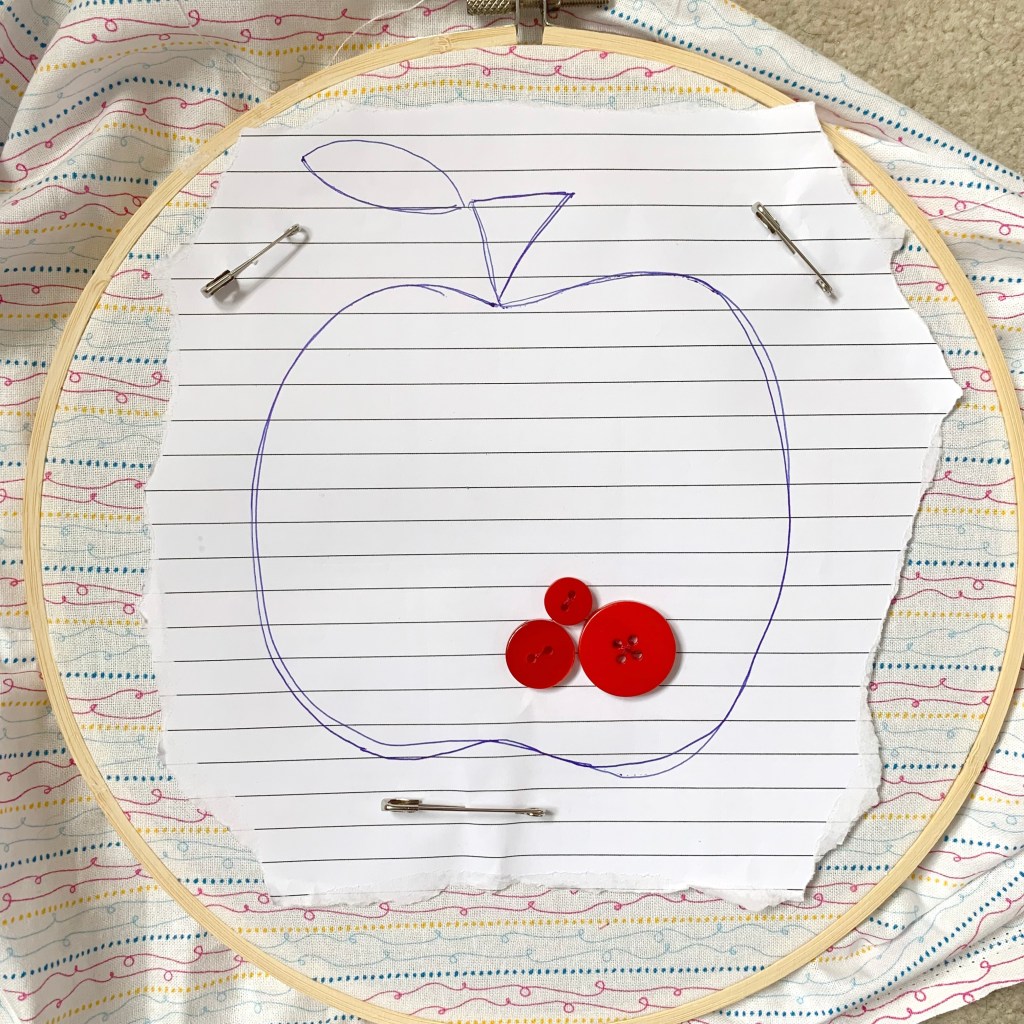 - Take your piece of paper and draw the outline of your apple – make sure the finished apple size will fit inside the hoop with stalk and writing details. Place the fabric in the embroidery hoop then pin the apple template onto it.