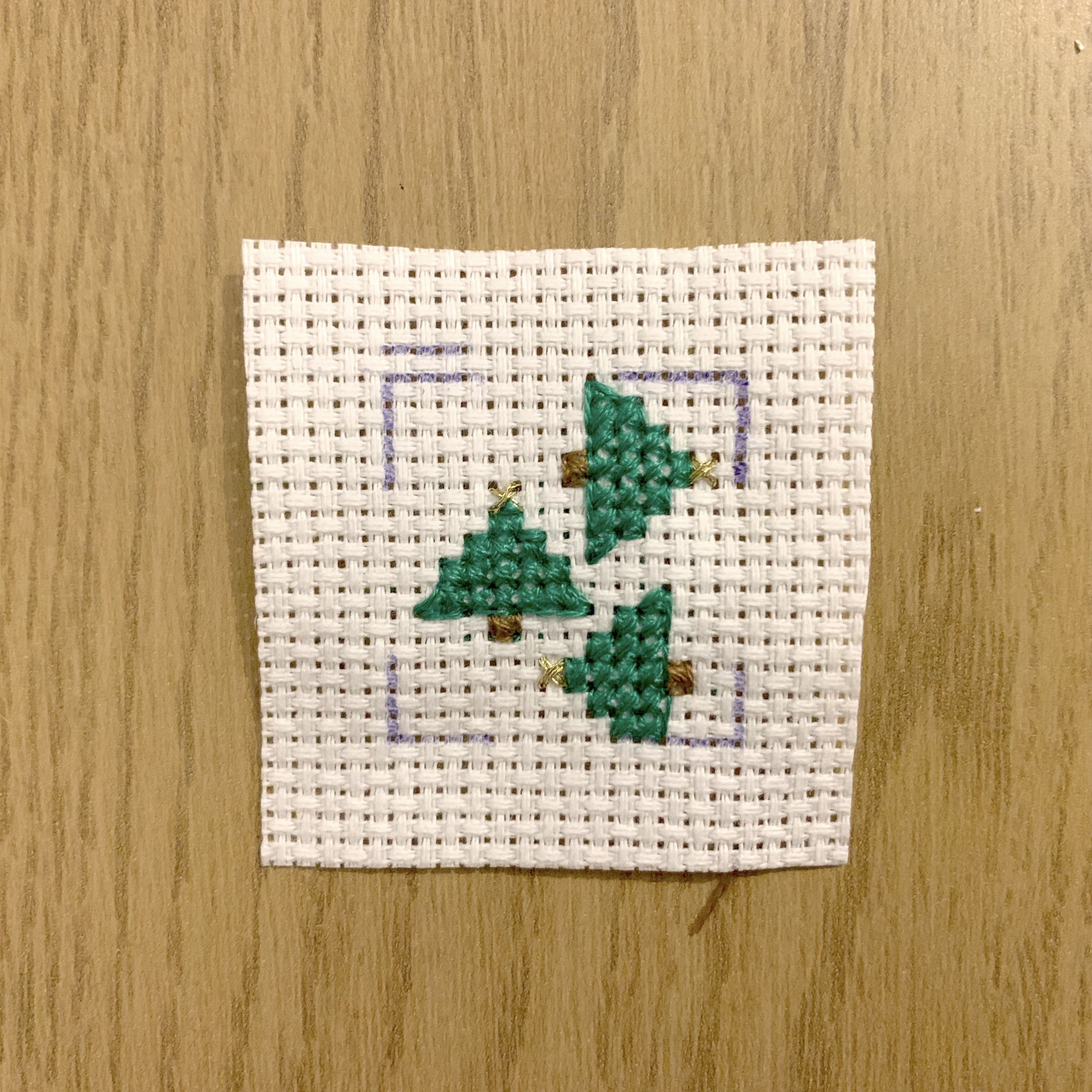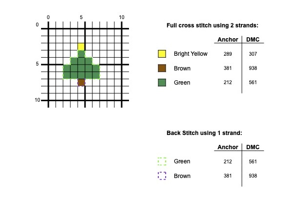 Next up in the Christmas cross stitch designs series is a mini Christmas tree. These have a yellow star on the top but you could use gold thread or a different colour completely. If you wanted to add some light details on them too you could do this using backstitch and French knots.