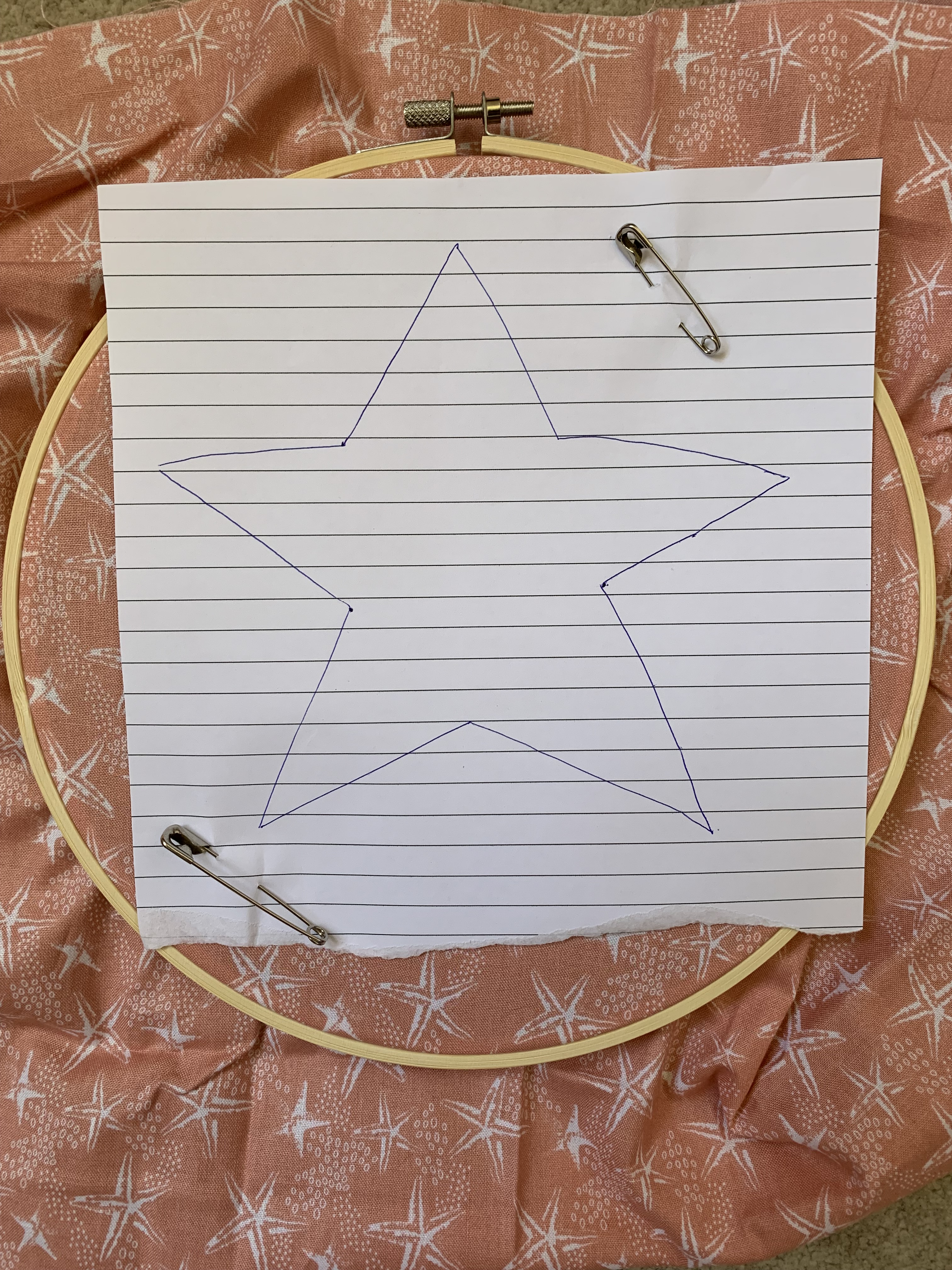 - Take your piece of paper and draw the outline of your star – make sure the finished star size will fit inside the hoop with stalk and writing details. Place the fabric in the embroidery hoop then pin the star template onto it.