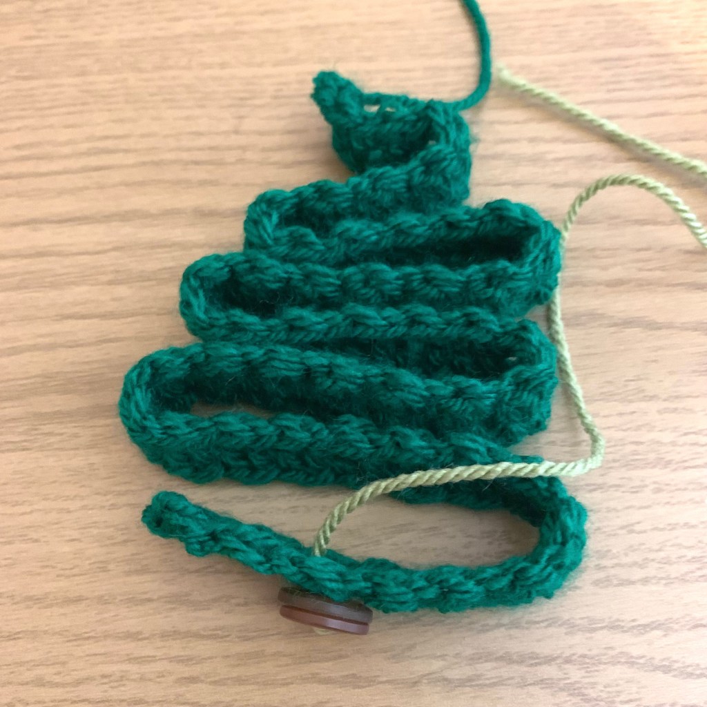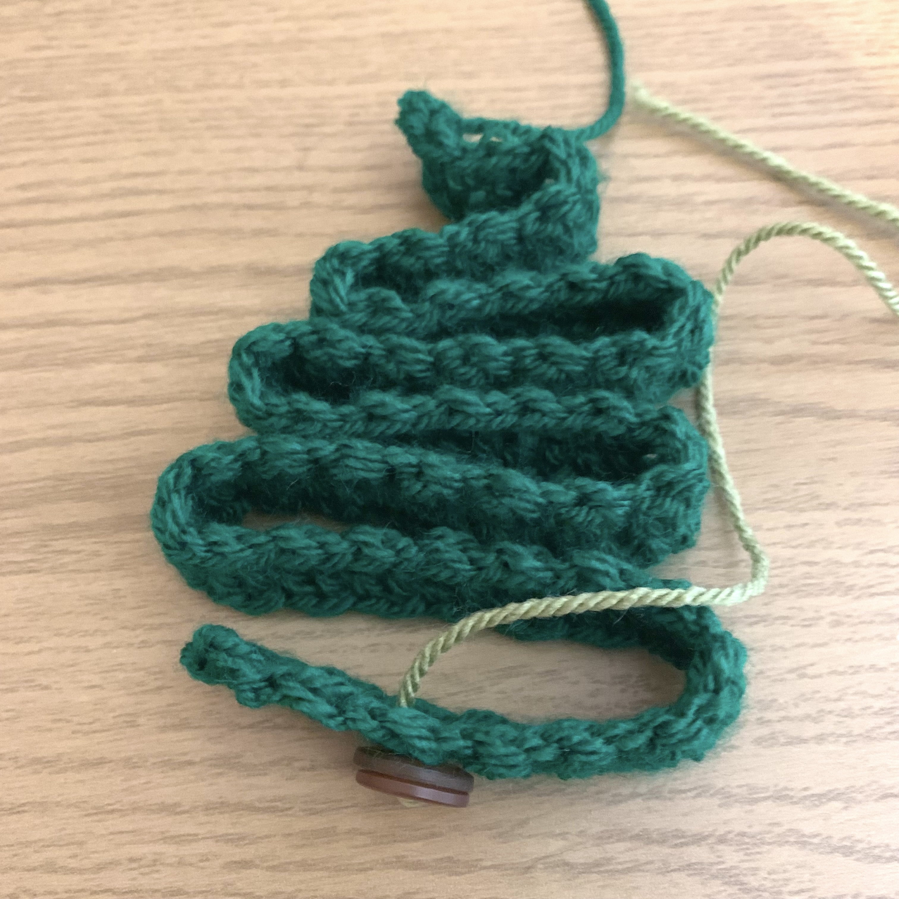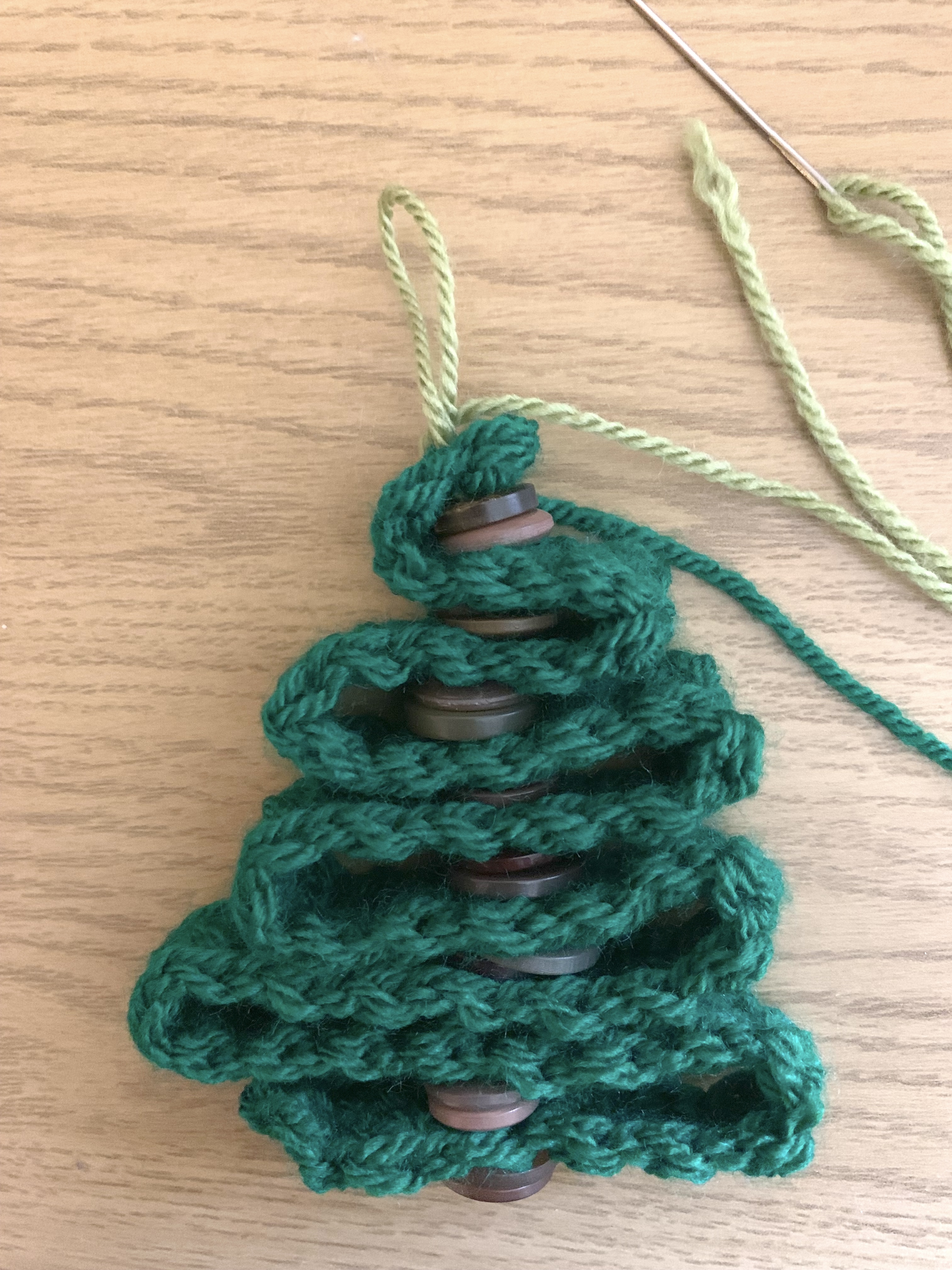 - Take the wool and cast on at the top of the tree create a loop then sew a few stitches to secure then fasten off. If using ribbon fold in half and sew to the top of the tree with a few stitches.