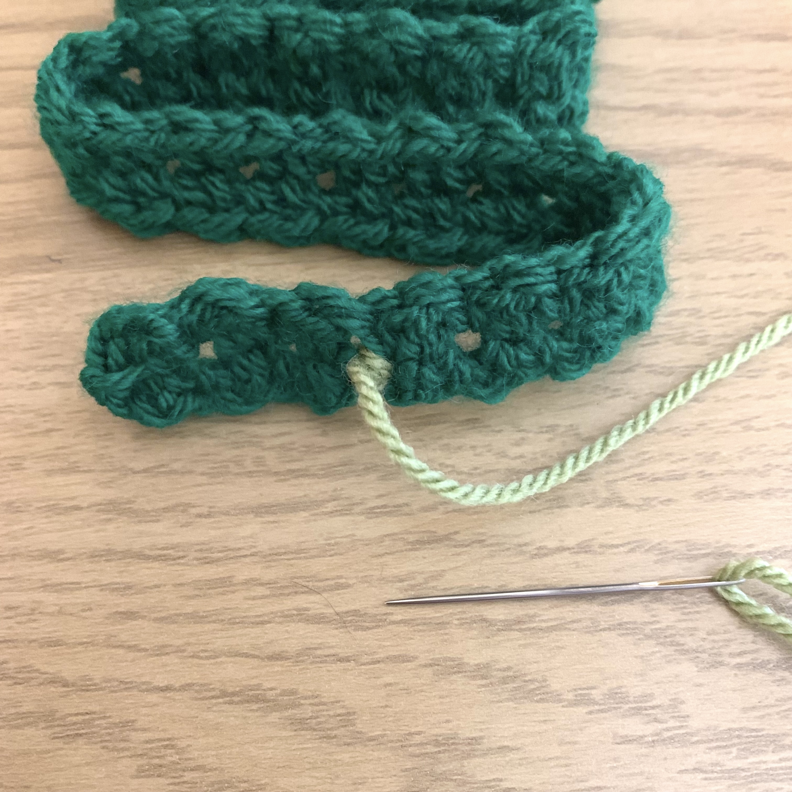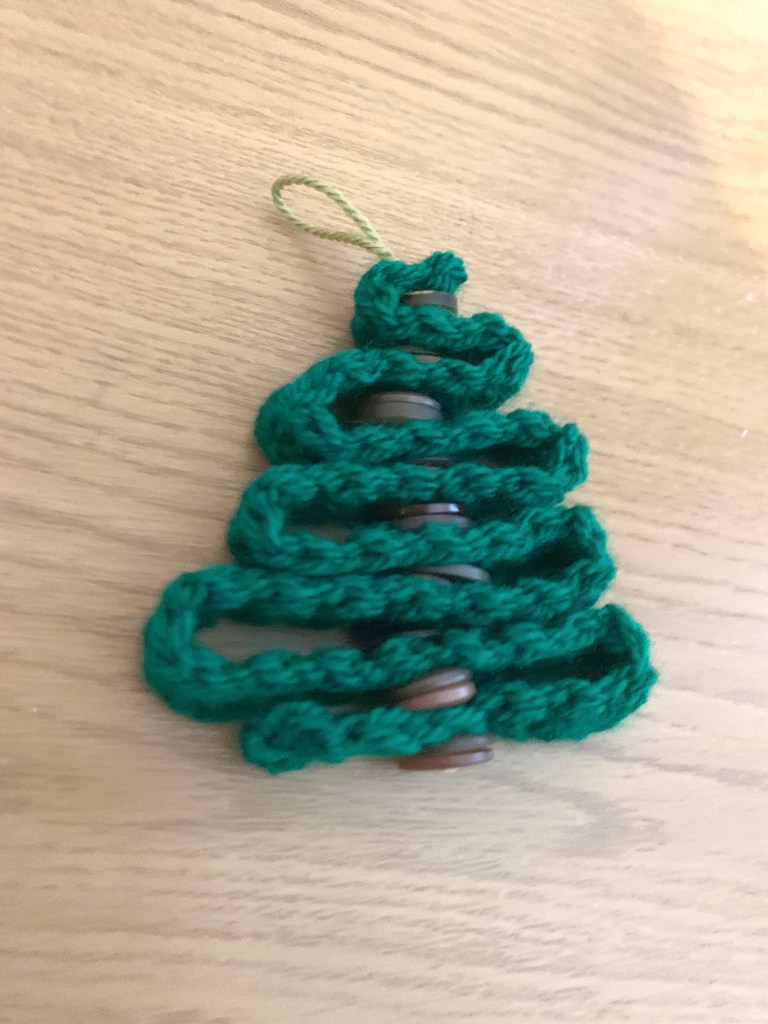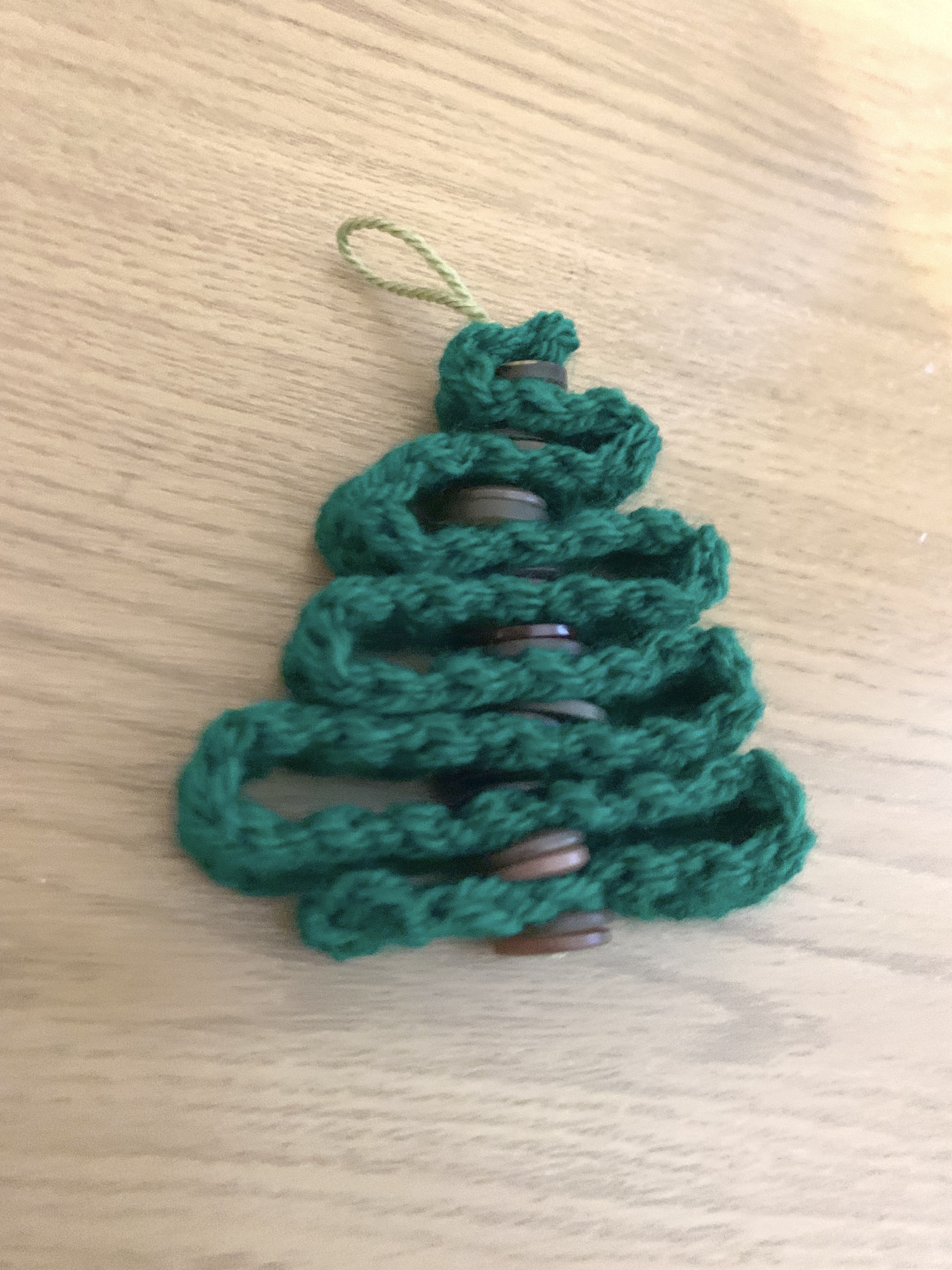 - Take the wool and cast on at the top of the tree create a loop then sew a few stitches to secure then fasten off. If using ribbon fold in half and sew to the top of the tree with a few stitches.