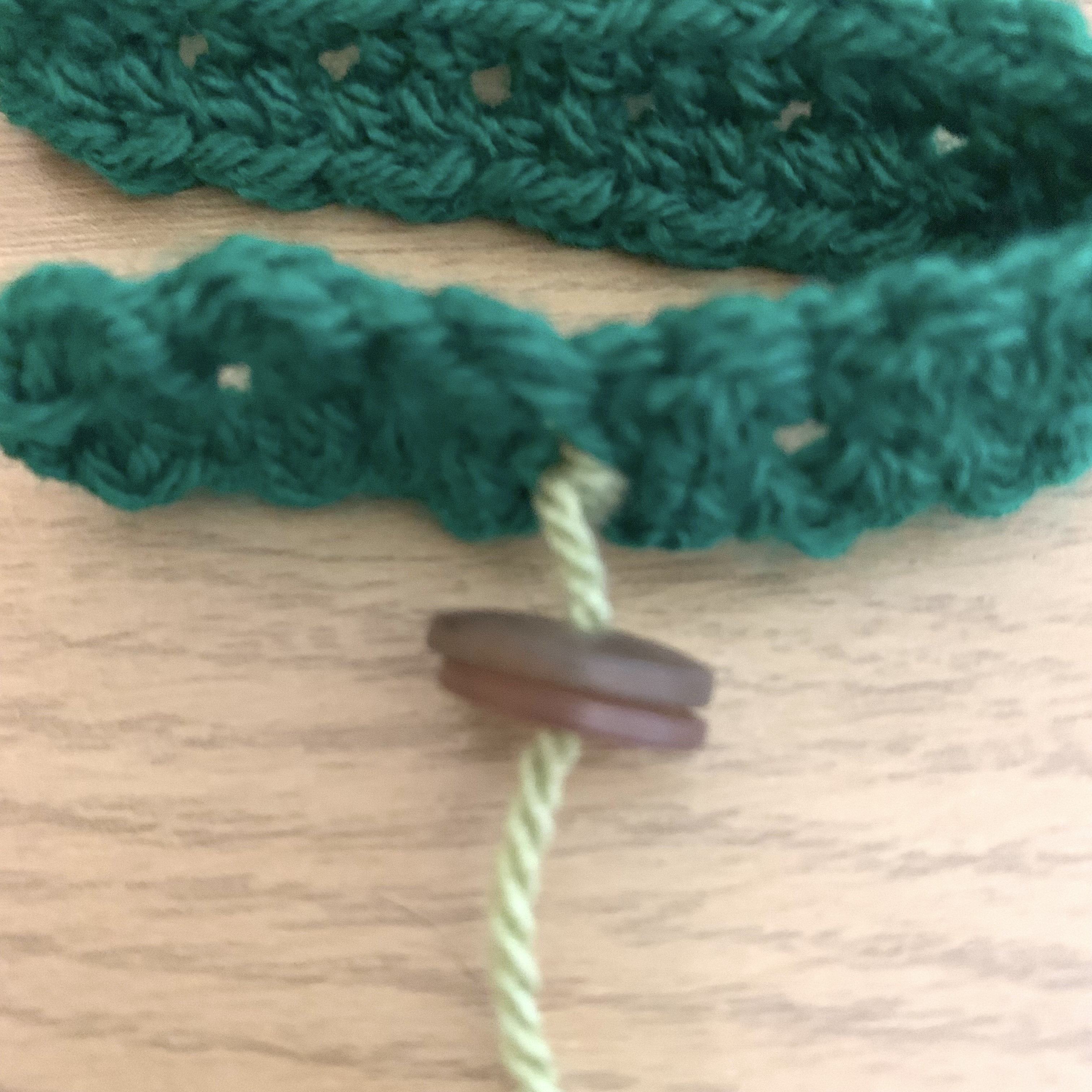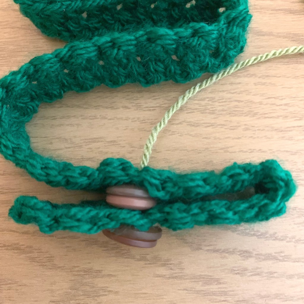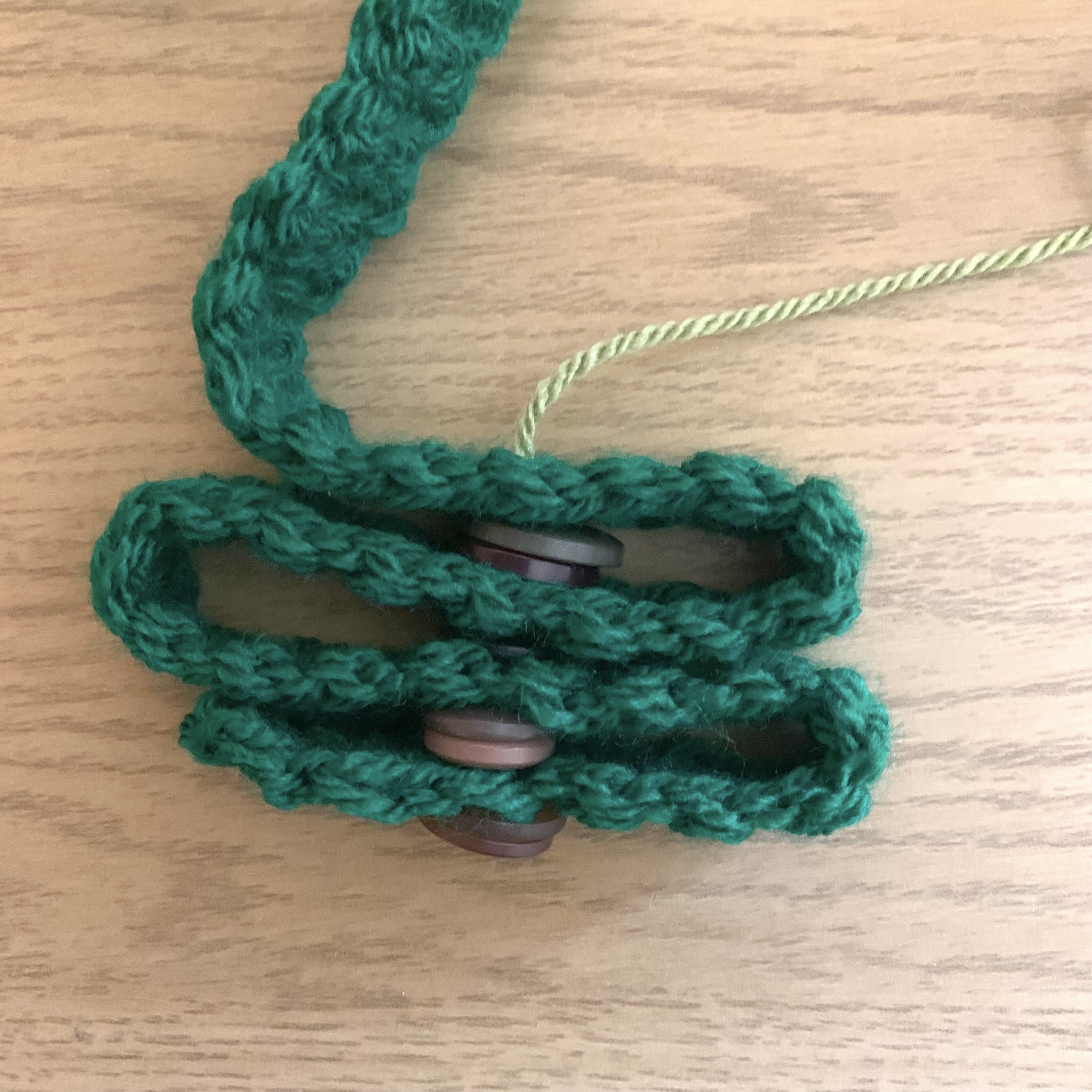 - Cast on at the middle of the bottom of the tree. Take the 2 buttons which will form the stump and sew to attach to the base by going down through one button hole then up through the second.