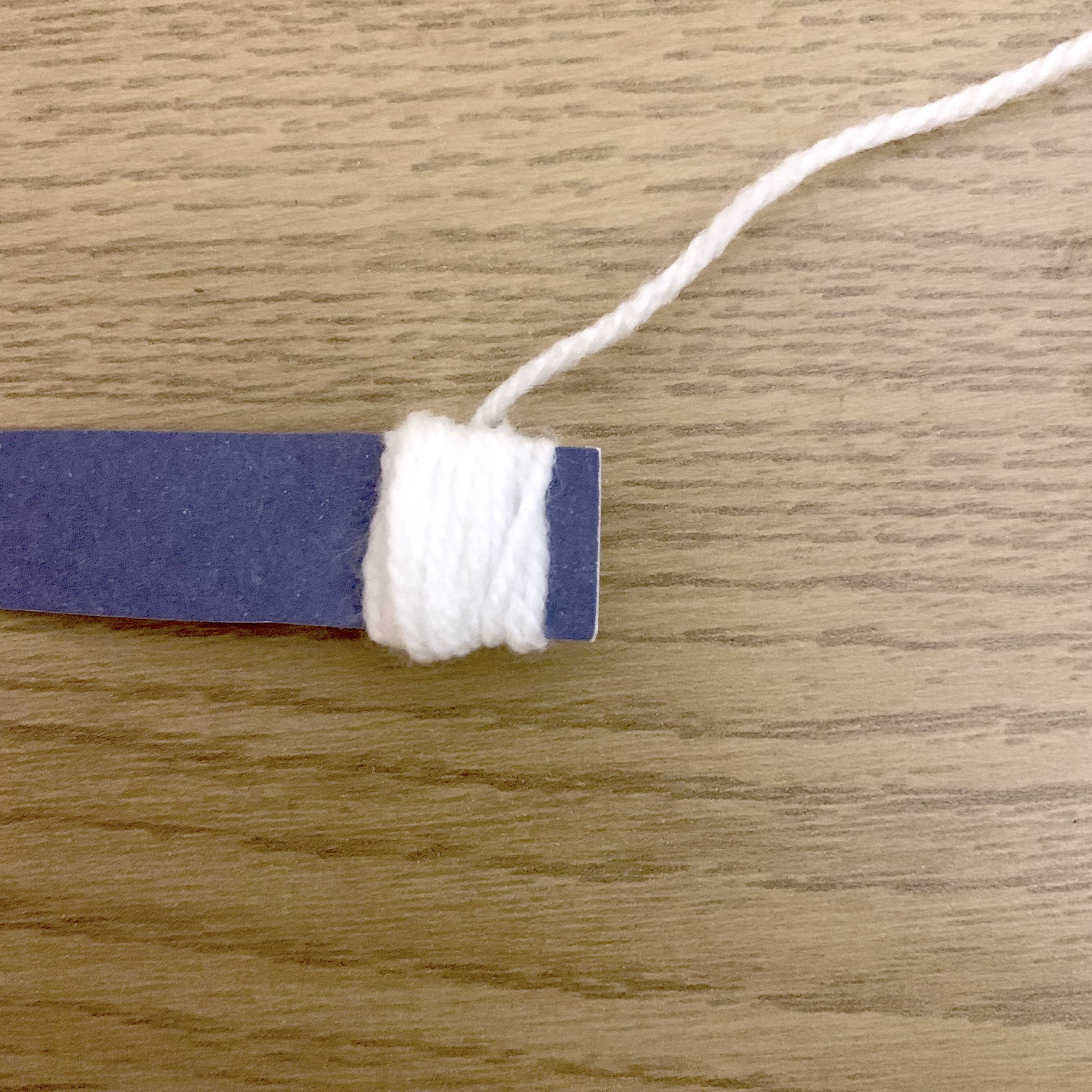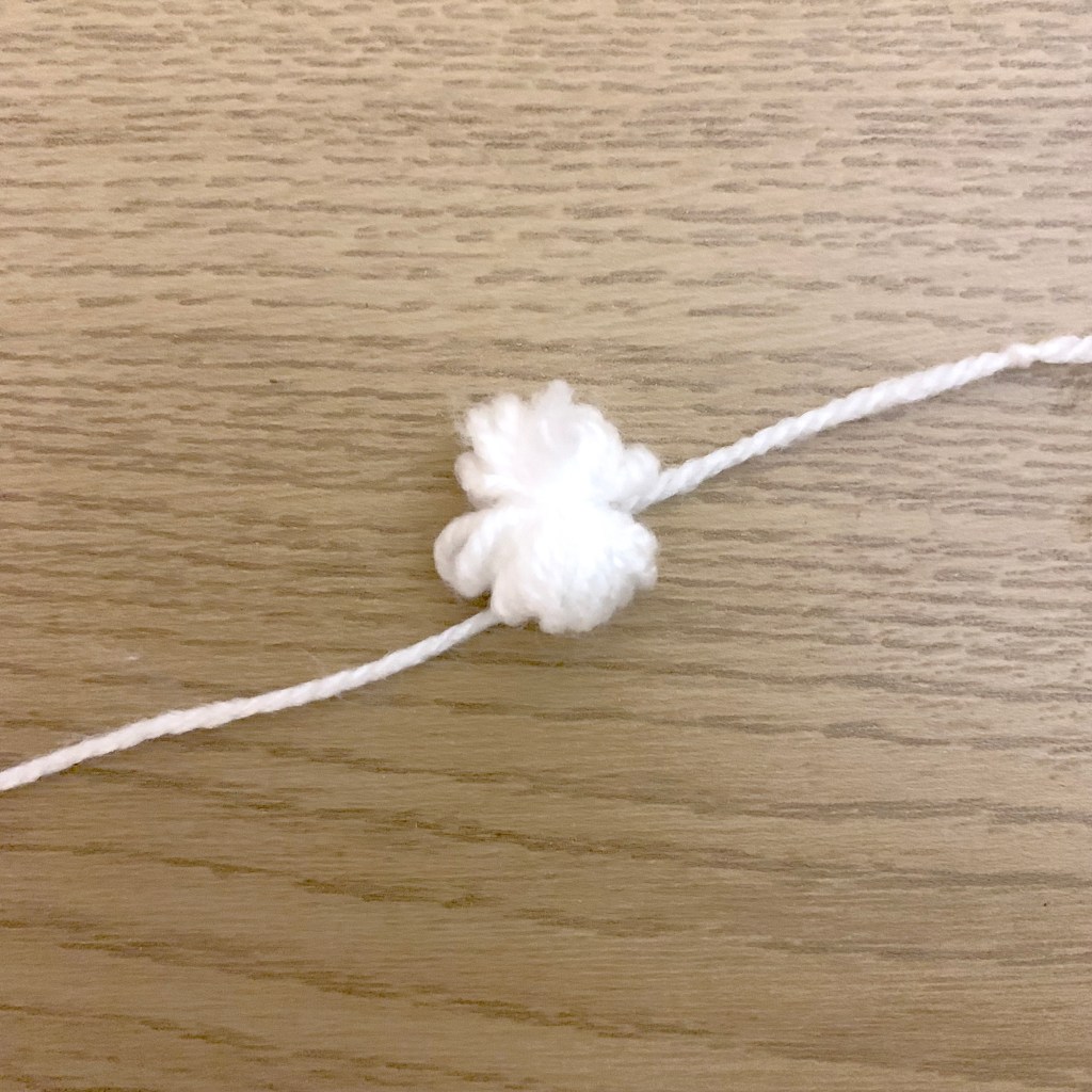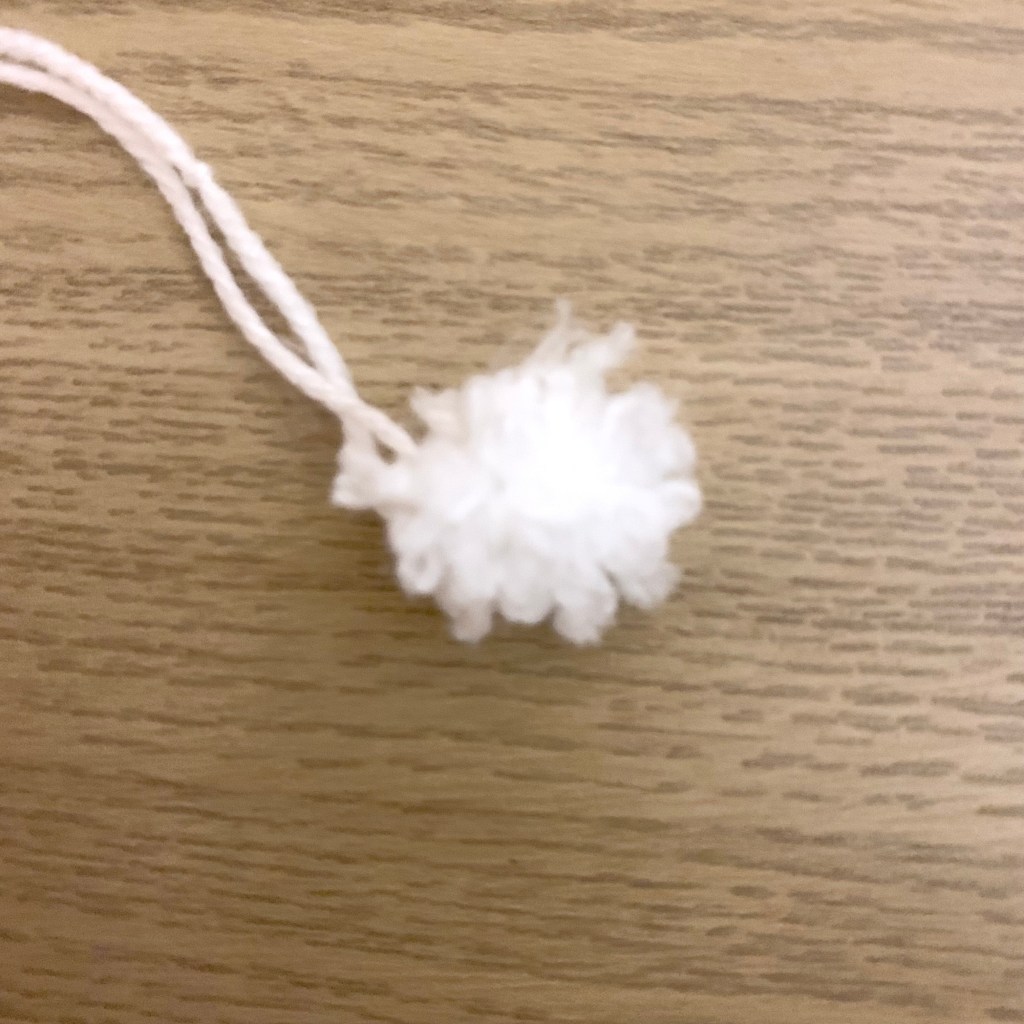 Take the 1cm wide strip of card and the white wool and wrap the white wool around the 1cm wide part of the card 20 times. Carefully pull the wool off from the card, tie around the middle using a 15cm long piece of the wool then cut the loops to make a mini pom pom.